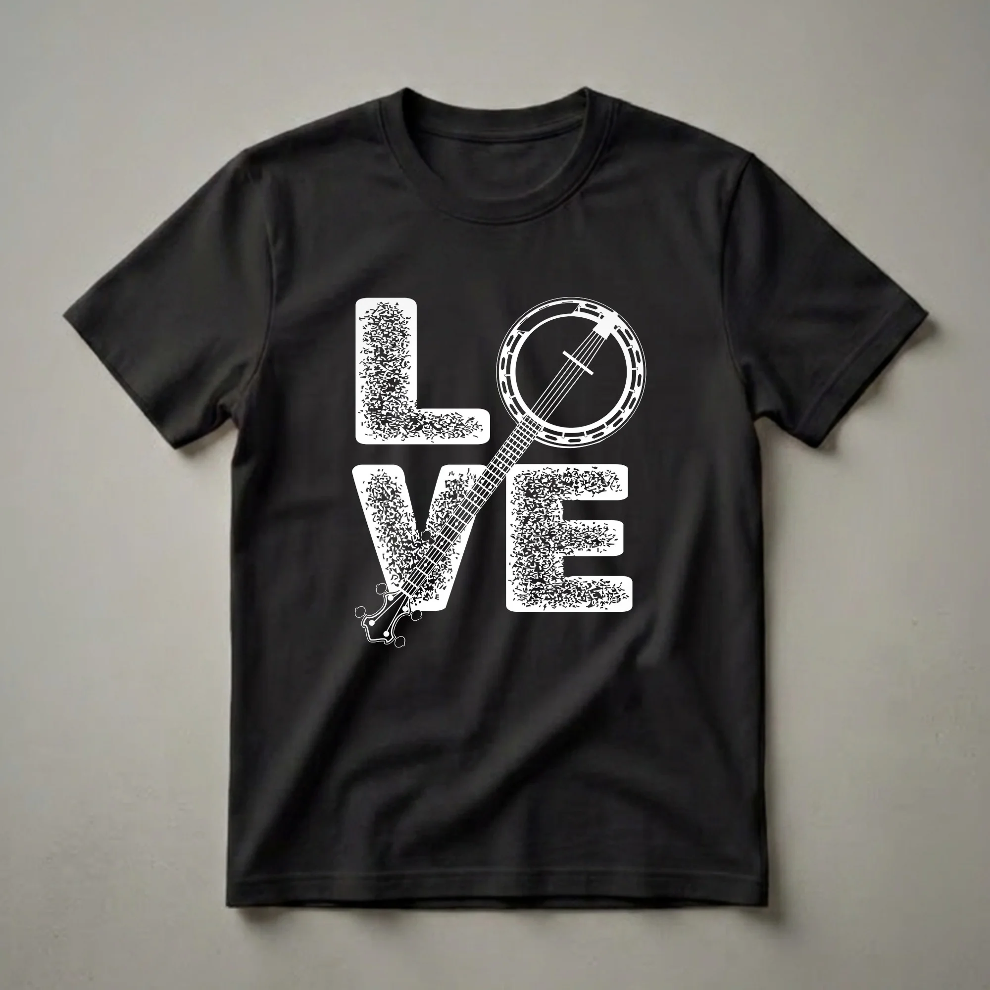 Musicians who play the banjo will reach for this unique graphic tee to showcase their passion. The design boldly spells out 'LOVE,' with the 'O' creatively replaced by the circular body of a banjo and the 'V' formed by the instrument's neck and headstock. The letters 'L' and 'E' are filled with a striking, distressed pattern, adding a touch of artistic flair. The banjo, a stringed instrument with a thin membrane stretched over a frame or cavity as a resonator, is known for its distinctive sound, often associated with folk, bluegrass, and country music genres. This shirt is a thoughtful gift for any banjo player, music enthusiast, or someone who appreciates unique instrument-themed apparel. Wear it to jam sessions, concerts, or casual outings to express your musical identity. It's a staple in the collection for anyone who loves the sound of a banjo. This tee is a go-to for expressing your musical soul.