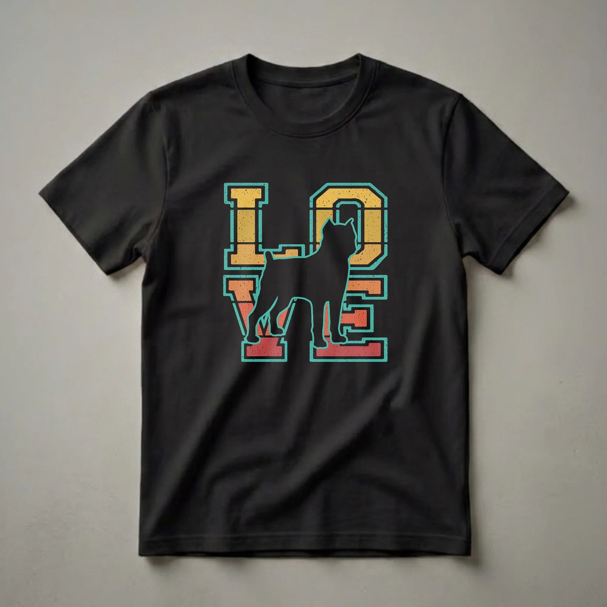 Brussels Griffon owners know their small dogs possess a big personality and a distinctive appearance. This retro-inspired graphic tee captures that affection with a striking design. The word 'LOVE' is presented in a vintage sunset color scheme, featuring layers of teal, yellow, orange, and red, all with a distressed texture for an authentic retro feel. Centered within the 'O' of 'LOVE' is the unmistakable silhouette of a Brussels Griffon, showcasing its characteristic facial features and sturdy build. This tee is a thoughtful gift for any Brussels Griffon mom or dad who cherishes their unique companion. The Brussels Griffon breed, originating from Belgium, is known for its alert and curious nature, often forming strong bonds with their families. This shirt works well for casual outings, dog park visits, or simply relaxing at home while celebrating your furry friend. It's a staple in the collection for anyone who wants to wear their canine devotion with pride. This t-shirt makes a thoughtful gift for birthdays or holidays for the Brussels Griffon enthusiast in your life.