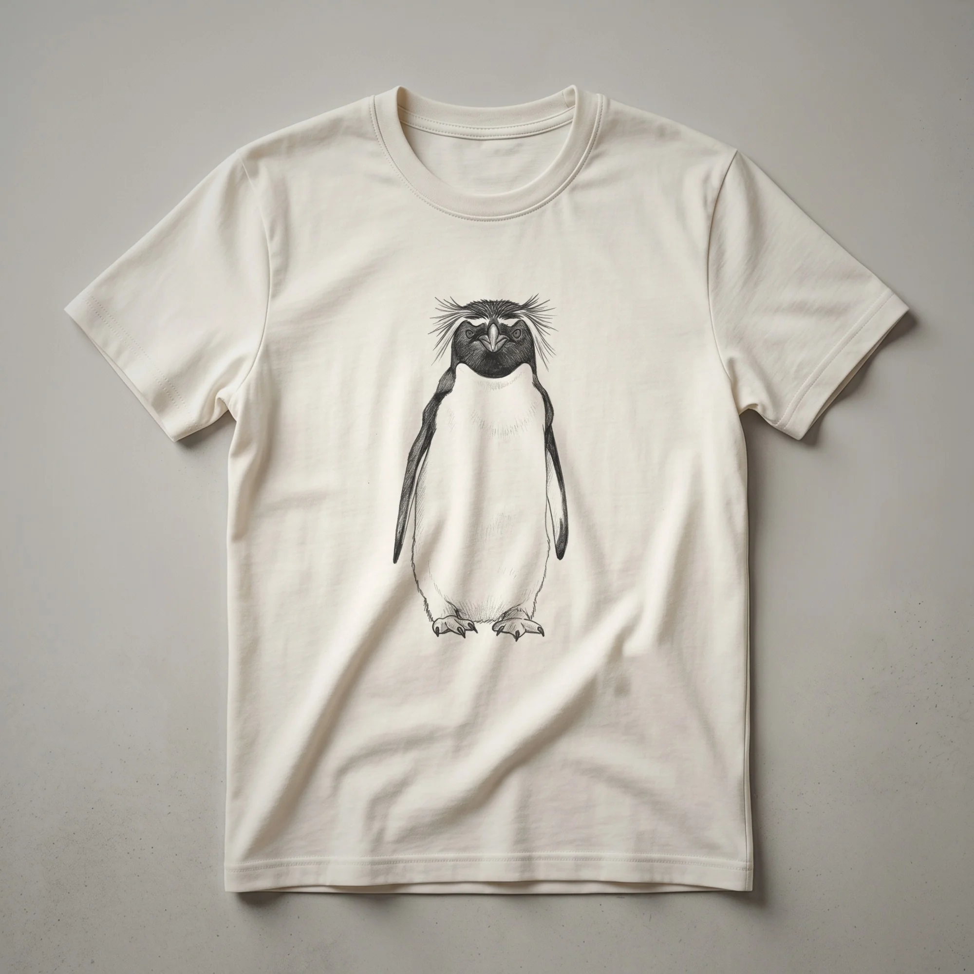 Macaroni penguins, known for their distinctive spiky yellow and white crest feathers and red eyes, are captured in a striking vintage line drawing on this t-shirt. These fascinating seabirds are found in the subantarctic region, breeding on islands like South Georgia and the Falklands. They are agile swimmers and divers, often foraging for krill, squid, and small fish. This graphic tee features a detailed, artistic rendition of the macaroni penguin, highlighting its unique appearance and wild spirit. It's a staple in the collection for anyone who appreciates avian art and the wonders of the natural world. This shirt makes a thoughtful gift for birdwatchers, wildlife enthusiasts, or anyone who admires these charismatic Antarctic residents. Wear it to your next nature walk or casual outing to spark conversations about these incredible birds.