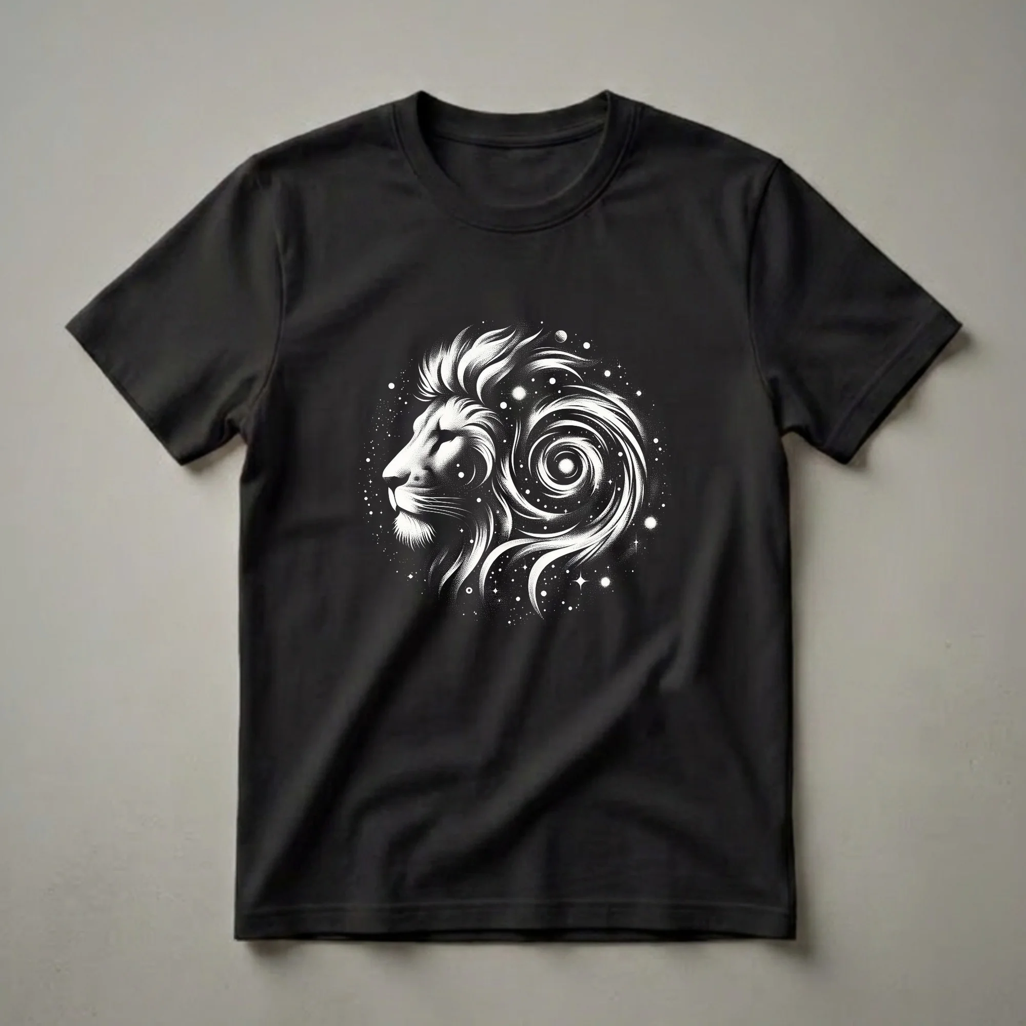 Lions, the majestic 'kings of the jungle,' are powerful symbols of courage and strength, and this graphic tee captures their regal presence with a cosmic twist. The design features a detailed lion's head in profile, rendered in a striking black and white illustration style. Swirling lines and scattered stars create a sense of a vast, starry night sky or a distant galaxy, enveloping the lion's mane and head. This eye-catching t-shirt is a thoughtful choice for wildlife enthusiasts, nature lovers, or anyone who appreciates the untamed beauty of these magnificent big cats. Lions are social animals, living in prides, and are found primarily in Africa and parts of India. This shirt works well for hikers, campers, or anyone who enjoys the great outdoors and wants to wear their passion. It makes a thoughtful gift for the wildlife photographer or the animal lover in your life who admires the lion's commanding aura. Wear this unique tee to your next outdoor adventure or casual gathering to spark conversations about the natural world.