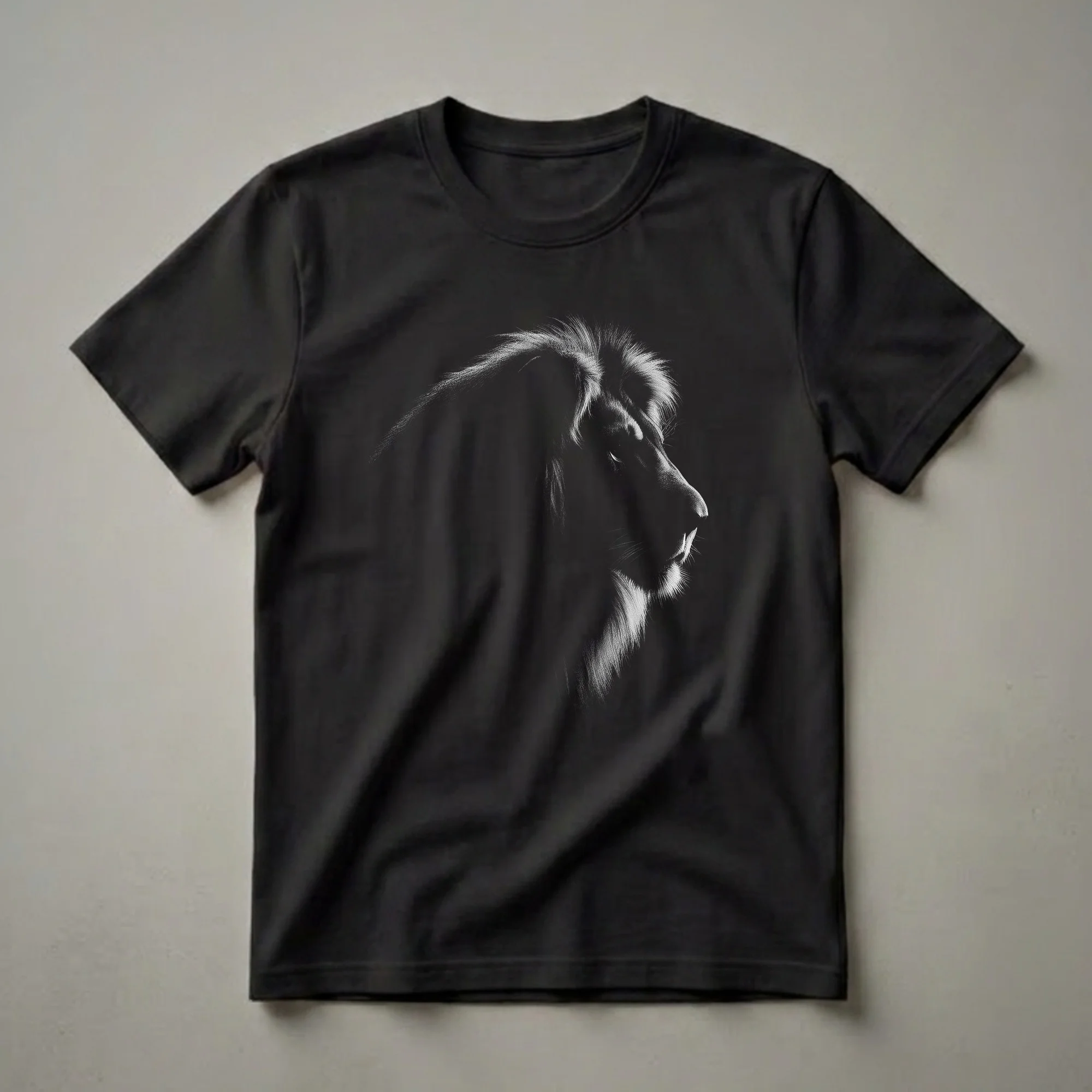 - This regal lion head t-shirt showcases a majestic black and white profile.