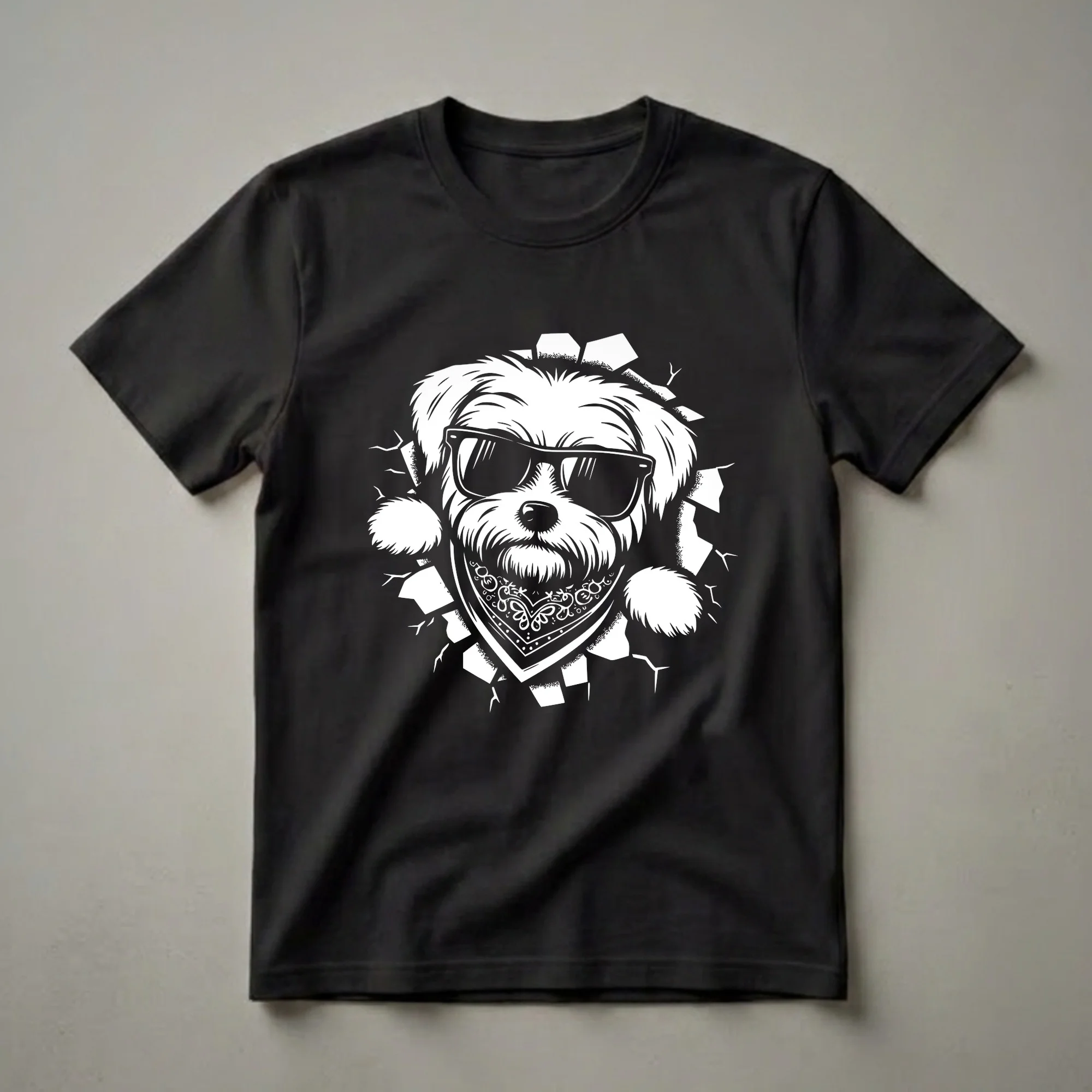 Showcase your love for playful pups with this eye-catching graphic t-shirt featuring a cool Maltese dog sporting sunglasses and a bandana.The design showcases a fluffy white Maltese peeking through a cracked wall, sporting stylish sunglasses and a classic paisley bandana. Maltese dogs are known for their gentle temperament and elegant appearance, making them a beloved companion breed. This shirt captures that playful yet sophisticated spirit. It's a thoughtful gift for any Maltese mom or dad, or for someone who simply loves dogs with a bit of swagger. Wear this unique t-shirt to casual outings, dog park visits, or just lounging at home. It’s a staple in the collection for any dog enthusiast looking to express their passion for their furry friend. This apparel is a go-to tee for expressing your unique style.