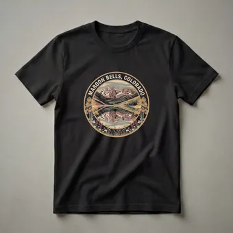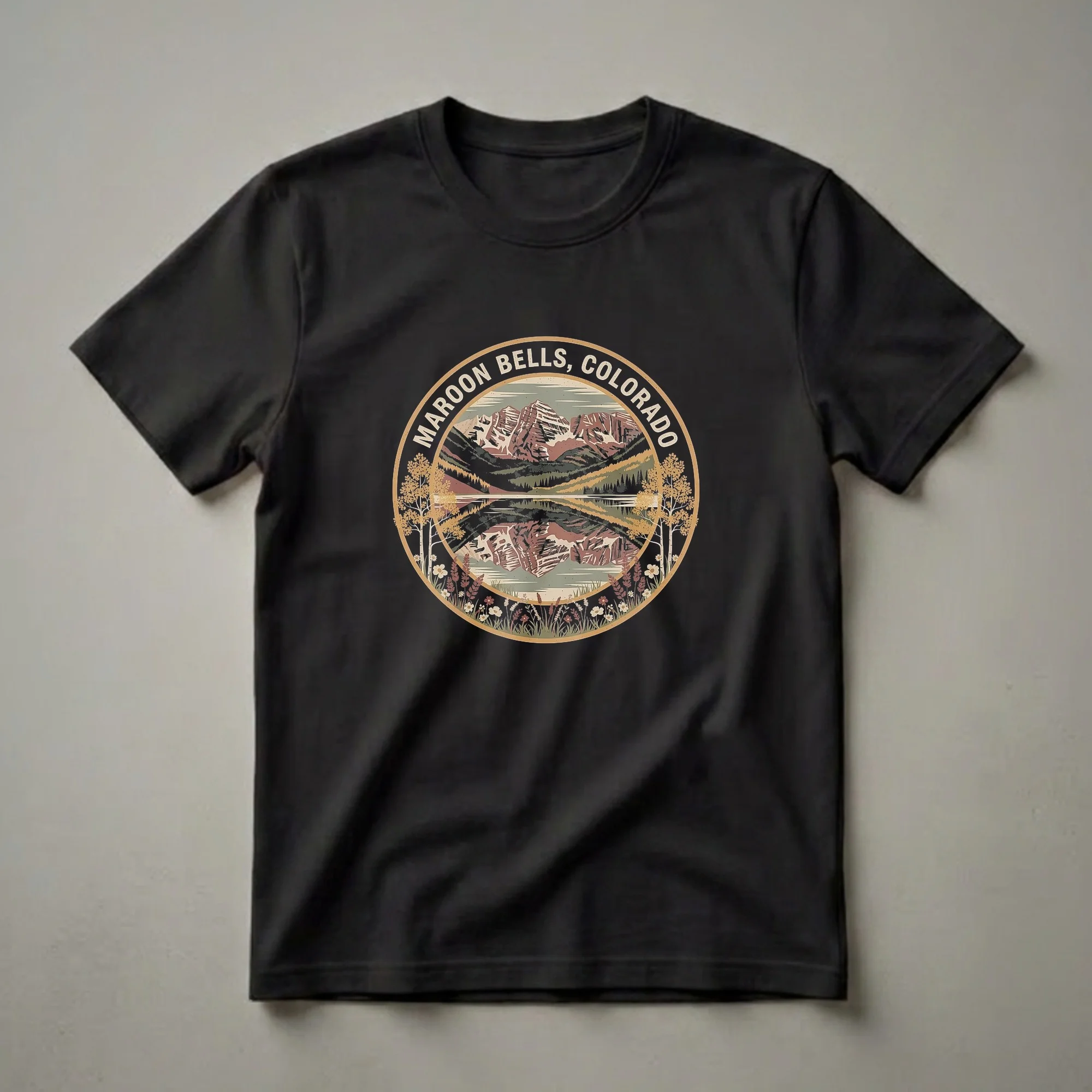 Colorado mountain enthusiasts will reach for this graphic tee that captures the breathtaking beauty of the Maroon Bells. This striking circular design showcases the majestic, snow-dusted peaks of the Maroon Bells, reflected in the still waters of Maroon Lake. The artwork features a vintage, drawing-style aesthetic with a palette of muted earth tones, including deep reds, greens, and creams, evoking a sense of nostalgia for classic travel posters. Lush pine forests flank the lake, while vibrant wildflowers and golden aspen trees frame the bottom and sides of the emblem, adding a touch of alpine charm. The Maroon Bells are a famous landmark in the Elk Mountains, part of the White River National Forest, and are renowned for their stunning natural beauty, especially during autumn when the aspen leaves turn brilliant gold. This t-shirt is a perfect way for hikers, skiers, and anyone who appreciates the grandeur of the Rocky Mountains to express their connection to this iconic Colorado landscape. It makes a thoughtful gift for friends or family who have visited or dream of exploring this picturesque region. Wear this shirt on your next outdoor adventure or casual outing to carry a piece of Colorado with you.