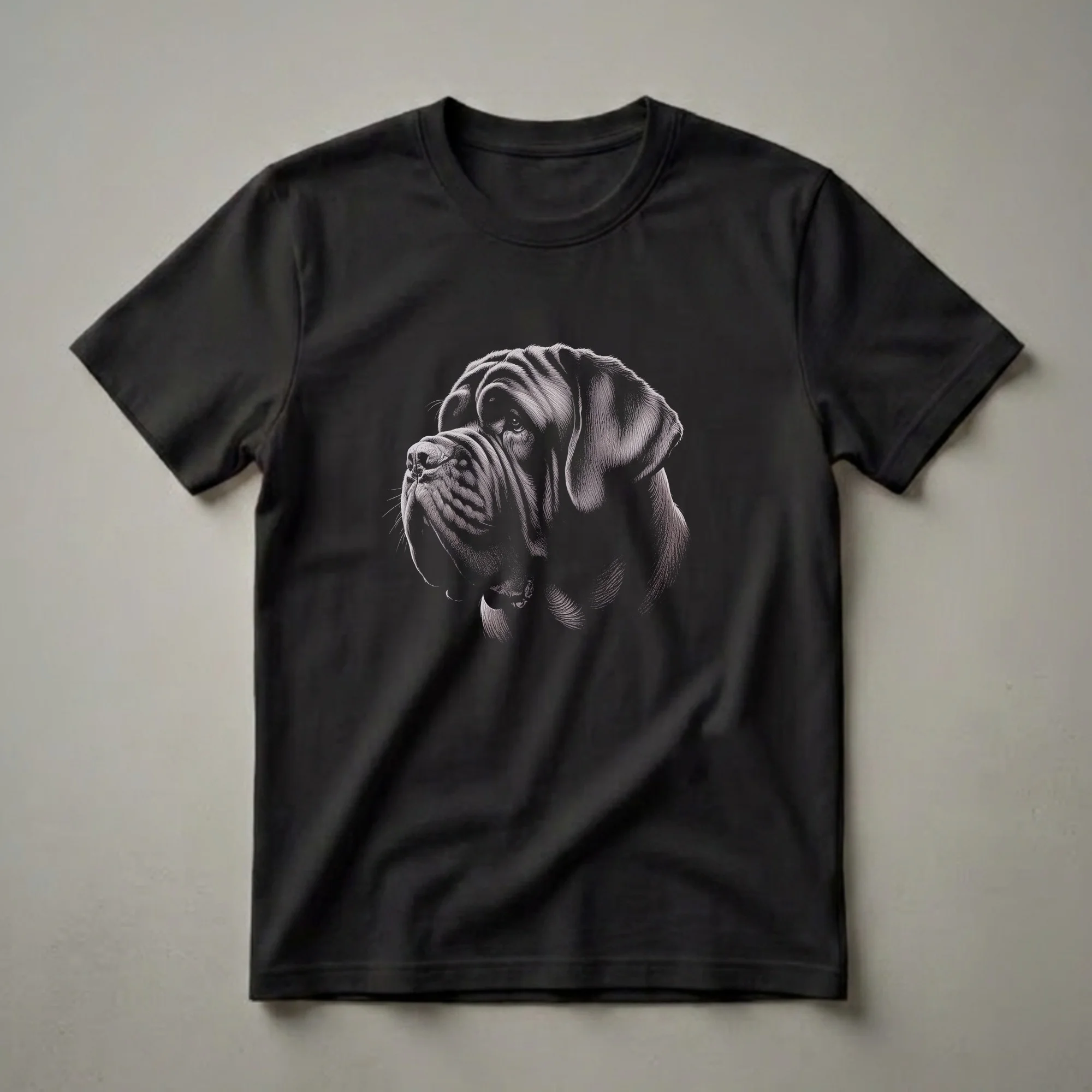 Mastiff owners and admirers of powerful canine breeds will appreciate the intricate detail in this striking graphic tee. The artwork features a Mastiff's head rendered in a scratchboard style, showcasing the breed's distinctive wrinkled brow, powerful jowls, and soulful eyes. This detailed illustration captures the noble and gentle nature often associated with the Mastiff breed, which originated in ancient times and was historically used as guard dogs and war dogs. The stark contrast of the detailed drawing against the solid black background gives this shirt an eye-catching, vintage wildlife art aesthetic. This t-shirt is a thoughtful gift for any Mastiff mom or dad who wants to display their affection for their large, loyal companion. It's a perfect way to express your passion for dogs, whether you're heading to a dog show, going for a walk in the park, or simply relaxing at home. This unique apparel piece celebrates the majestic presence of the Mastiff, making it a go-to tee for breed enthusiasts.