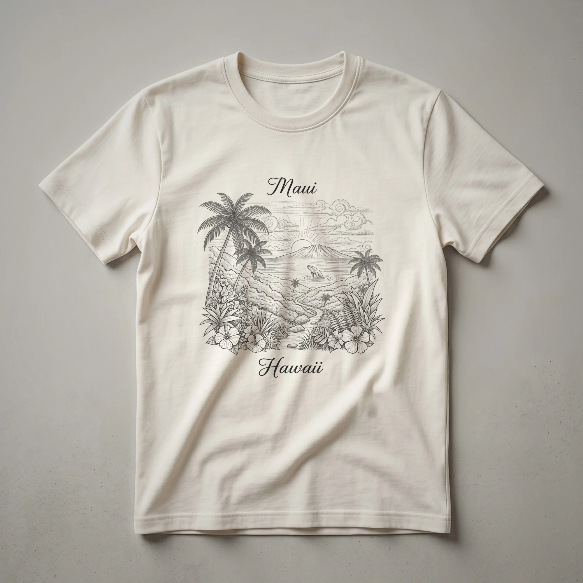 Maui, the Valley Isle, beckons with its stunning natural beauty, captured in this artistic sketch design. This t-shirt showcases a serene Hawaiian landscape, featuring iconic palm trees framing a view of lush, rolling hills leading to majestic mountains in the distance. The ocean stretches out, with a graceful whale breaching the surface, a testament to the rich marine life surrounding the islands. Tropical flowers and foliage adorn the foreground, adding to the vibrant island atmosphere. The word 'Maui' is elegantly scripted above the scene, with 'Hawaii' written below, grounding the design in its specific island identity. This graphic tee is a wonderful way for anyone who has visited or dreams of visiting Maui to carry a piece of paradise with them. It's a thoughtful gift for travelers who cherish their Hawaiian memories or for those who long to experience the aloha spirit firsthand. Wear this shirt to casual outings, beach days, or while reminiscing about your island adventures, bringing a touch of Hawaiian charm wherever you go. This apparel serves as a constant reminder of the breathtaking scenery and unique culture of Maui.
