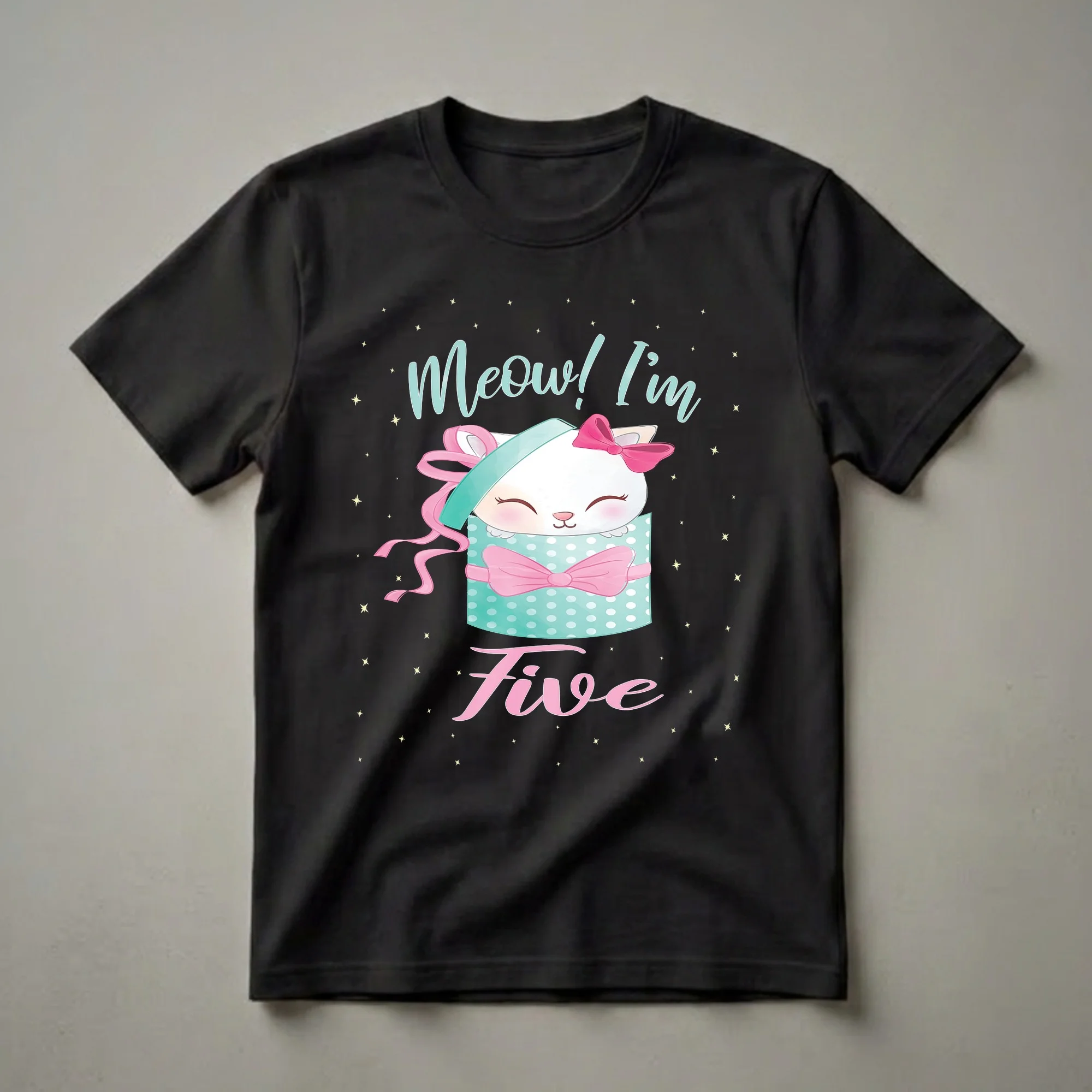 Five-year-old girls who adore kittens will reach for this delightful "Meow I'm Five" birthday tee. The graphic features a sweet cartoon white kitten with a pink bow peeking out of a teal gift box adorned with a larger pink bow and polka dots. The words "Meow! I'm" are written in a playful teal script above the kitten, and "Five" is prominently displayed in a fun pink font below. Scattered yellow stars on a black background add a whimsical touch, making this shirt a standout for any birthday celebration. This t-shirt is a thoughtful gift for any little girl celebrating her fifth birthday, especially if she has a fondness for cats or enjoys playful, cute designs. It's a wonderful choice for birthday parties, family gatherings, or just everyday wear, allowing her to showcase her special age with feline flair. The vibrant colors and charming illustration make this a memorable piece of apparel for a milestone birthday.