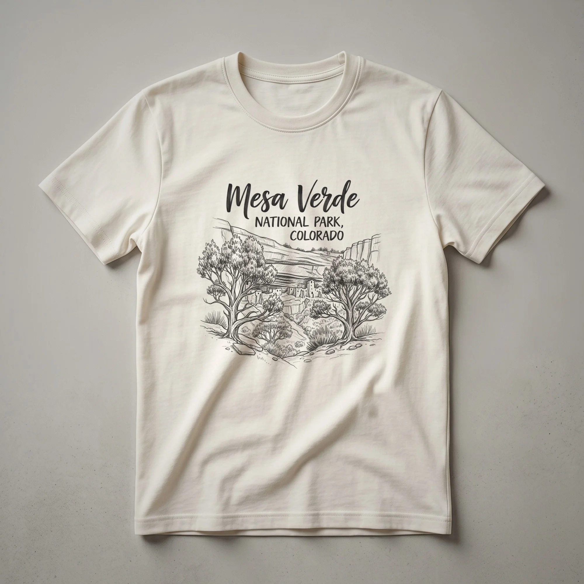 Mesa Verde National Park in Colorado is renowned for its remarkably preserved Ancestral Puebloan cliff dwellings. This sketch art tee captures the essence of this historic landscape, featuring the iconic cliffside structures nestled within the rugged terrain. The design showcases the park's natural beauty with detailed trees and rocky outcrops, evoking the spirit of exploration and adventure. Mesa Verde, meaning 'green table' in Spanish, is a UNESCO World Heritage site, offering a glimpse into a rich cultural past. This graphic t-shirt is a thoughtful choice for anyone who has explored its trails, marveled at its ancient architecture, or dreams of visiting. It serves as a wearable memento of the park's unique geological formations and the enduring legacy of its original inhabitants. Whether you're a seasoned hiker, a history buff, or simply appreciate striking natural scenery, this shirt is a great way to express your connection to this extraordinary national park. It makes a thoughtful gift for friends and family who cherish outdoor adventures and the American Southwest. Wear this tee on your next hike or casual outing to share your passion for Mesa Verde.