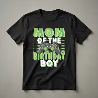 For the proud mom whose son is celebrating a birthday, this gamer t-shirt is a fantastic way to show your support. The graphic features bold, green lettering with a white outline and a striped texture, proclaiming 'MOM OF THE BIRTHDAY BOY'. Centered within the text is a realistic depiction of a black video game controller, complete with buttons and joysticks, set against a backdrop of scattered green polka dots. This design clearly communicates your role as the parent of a young gamer on his special day. It’s a thoughtful gift for any mother who enjoys watching her son play video games or who wants to join in the fun. This tee works well for birthday parties, family gatherings, or even just a casual day out. Imagine wearing this to your son's birthday party, feeling connected to his passion and celebrating his milestone. This shirt is a staple for any gamer mom's wardrobe, making it a go-to tee for any occasion related to her son's birthday.