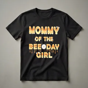 Mommy of the Bee Day Girl birthday shirts are a delightful way for mothers to celebrate their daughter's special occasion. This graphic tee features bold, orange letters that appear to be dripping with honey, set against a black background. Each letter is filled with a honeycomb pattern, and several cartoon bees buzz around the text, adding a playful touch. A white daisy is centrally placed within the word "BEE," further enhancing the sweet, natural theme. This shirt is a thoughtful choice for moms who want to coordinate with their daughter's bee-themed birthday party, creating memorable photo opportunities. The phrase "Mommy of the Bee Day Girl" clearly identifies the wearer's role and the event. Bees are known for their industrious nature and their vital role in pollination, a fact that adds a subtle layer of appreciation for nature's wonders. This t-shirt makes a thoughtful gift for any mother whose child is having a bee-themed celebration, ensuring she feels part of the fun. It's a great choice for wearing to the birthday party, family gatherings, or even for casual outings leading up to the big day.