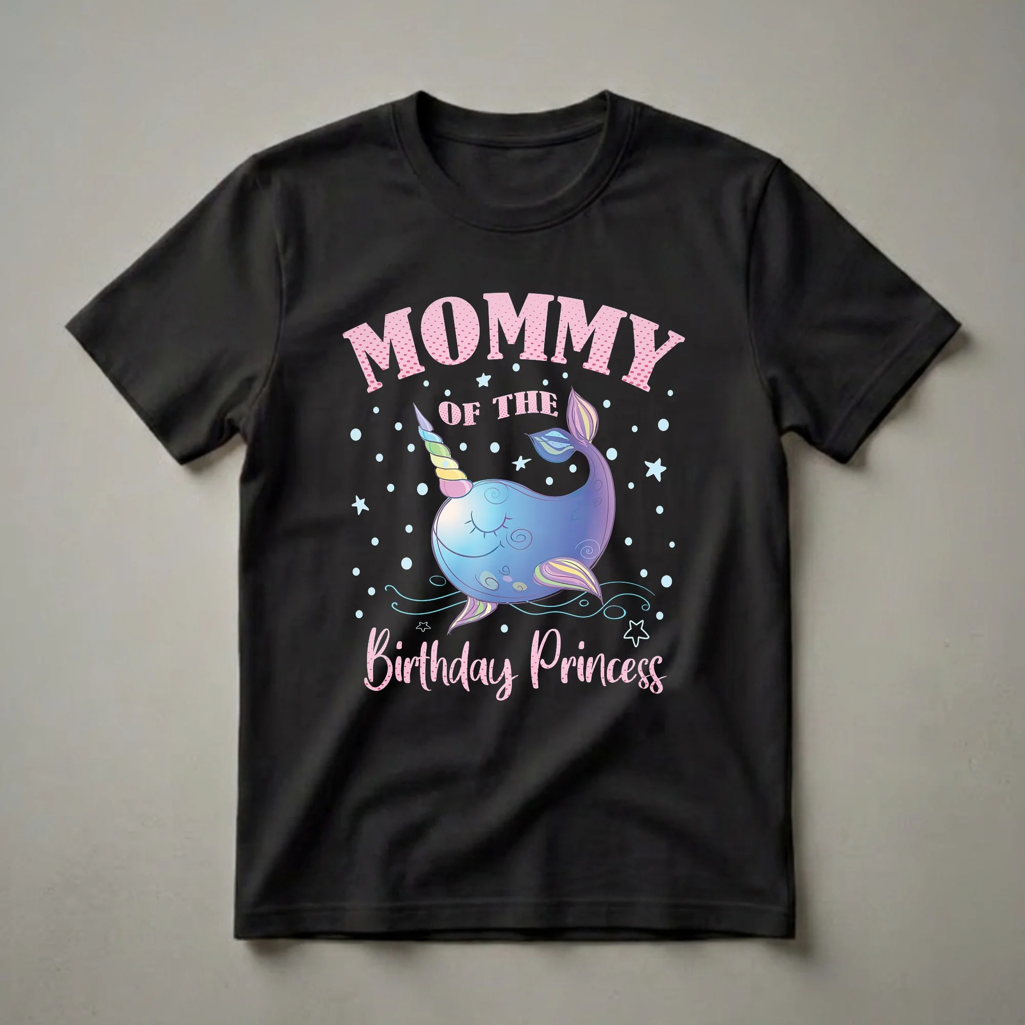 Mommy of the birthday princess, celebrate your little one's special day with this unicorn narwhal graphic tee. This eye-catching graphic tee celebrates the special bond between a mother and her daughter on her birthday. The design features a whimsical narwhal, a creature often called the 'unicorn of the sea,' complete with a spiraled unicorn horn and a flowing, rainbow-colored mane and tail. It's surrounded by playful stars and bubbles against a classic black background, making the vibrant artwork pop. The text 'Mommy Of The Birthday Princess' is presented in a charming, pink polka-dotted font, perfectly complementing the magical theme. This t-shirt is a thoughtful gift for any mom whose daughter is celebrating a birthday and loves mythical creatures. It's a wonderful way for moms to show their pride and join in the birthday fun. Imagine wearing this tee to a birthday party, a family gathering, or even just for a special birthday brunch. It's a comfortable and festive addition to any mom's wardrobe, made for making birthday memories. This shirt is a go-to for moms who want to feel connected to their little princess's big day.