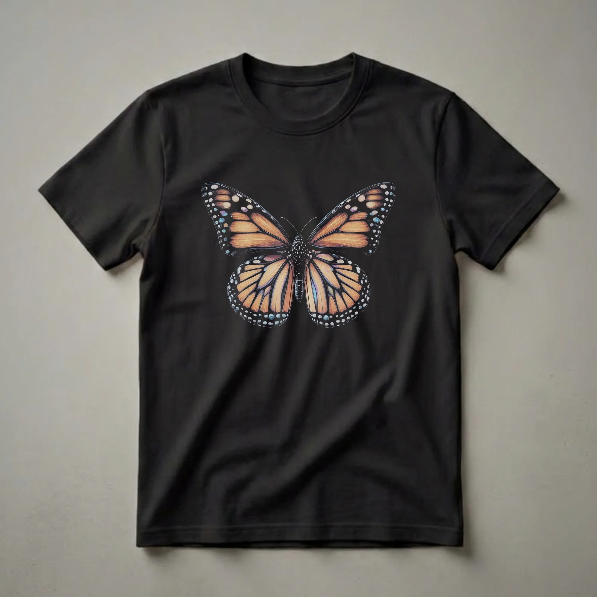 Nature enthusiasts and wildlife admirers will appreciate the intricate detail of this Monarch butterfly graphic tee. The artwork features a highly realistic depiction of the iconic butterfly, showcasing its vibrant orange wings with black veins and white-spotted borders. Subtle hints of blue and purple add depth to the wing patterns, creating an eye-catching visual. Monarch butterflies (Danaus plexippus) are renowned for their incredible annual migration across North America, traveling thousands of miles from Canada and the United States to overwintering sites in Mexico. This shirt is a wonderful way for women who appreciate the beauty of insects and the wonders of the natural world to express their passion. It makes a thoughtful gift for any nature lover, entomologist, or someone who simply admires the delicate beauty of these migratory insects. Wear this unique t-shirt on your next nature walk, to a butterfly garden visit, or simply as a statement piece that celebrates the natural world. This apparel is a staple for anyone who finds joy in observing wildlife.