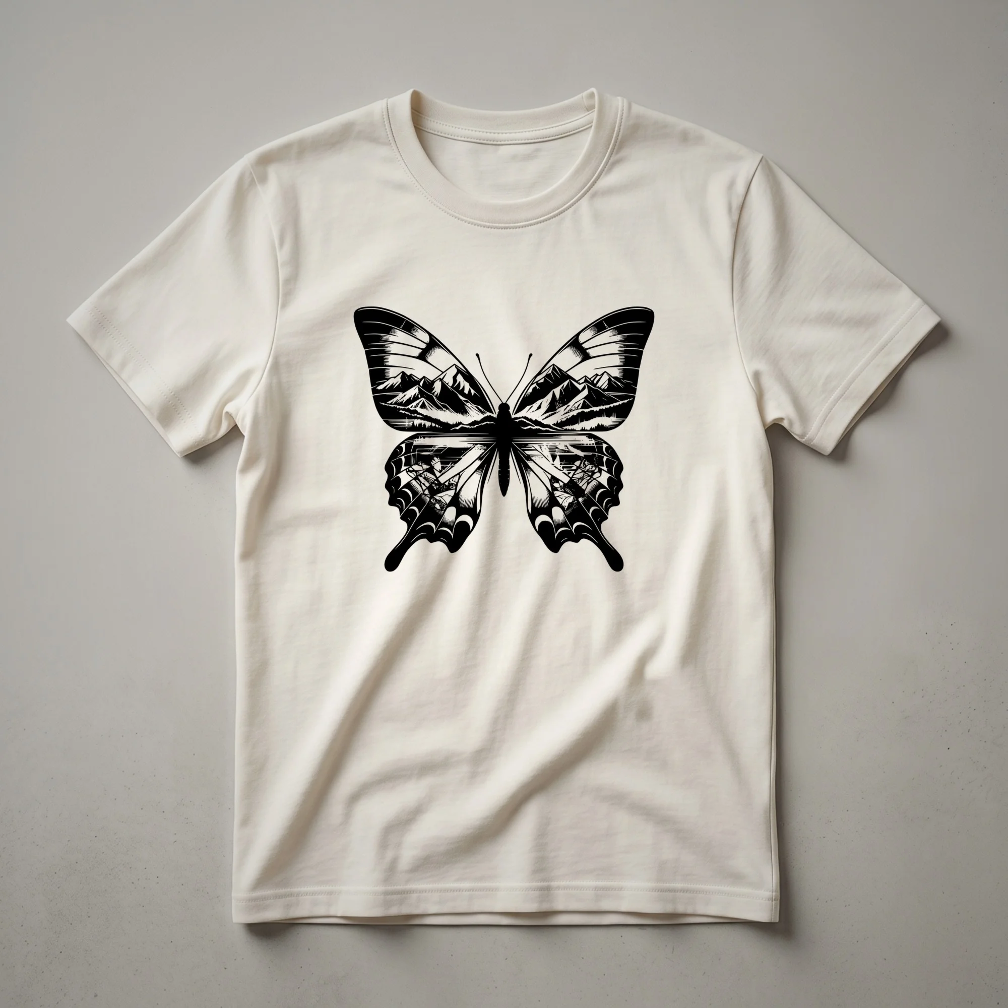 Nature lovers and butterfly enthusiasts will reach for this striking graphic tee. The design features a detailed vintage illustration of a monarch butterfly, its wings intricately filled with a serene nature scene. This scene includes rolling hills, trees, and a hint of a winding path, evoking a sense of peaceful exploration. Monarch butterflies, known for their impressive migratory journeys across North America, symbolize transformation and resilience. This t-shirt is a wonderful way for anyone who appreciates the beauty of insects and the great outdoors to express their passion. It makes a thoughtful gift for hikers, entomologists, or anyone who finds joy in the natural world. Wear this shirt on your next outdoor adventure or casual outing to spark conversations about the wonders of lepidoptery and the environment.
