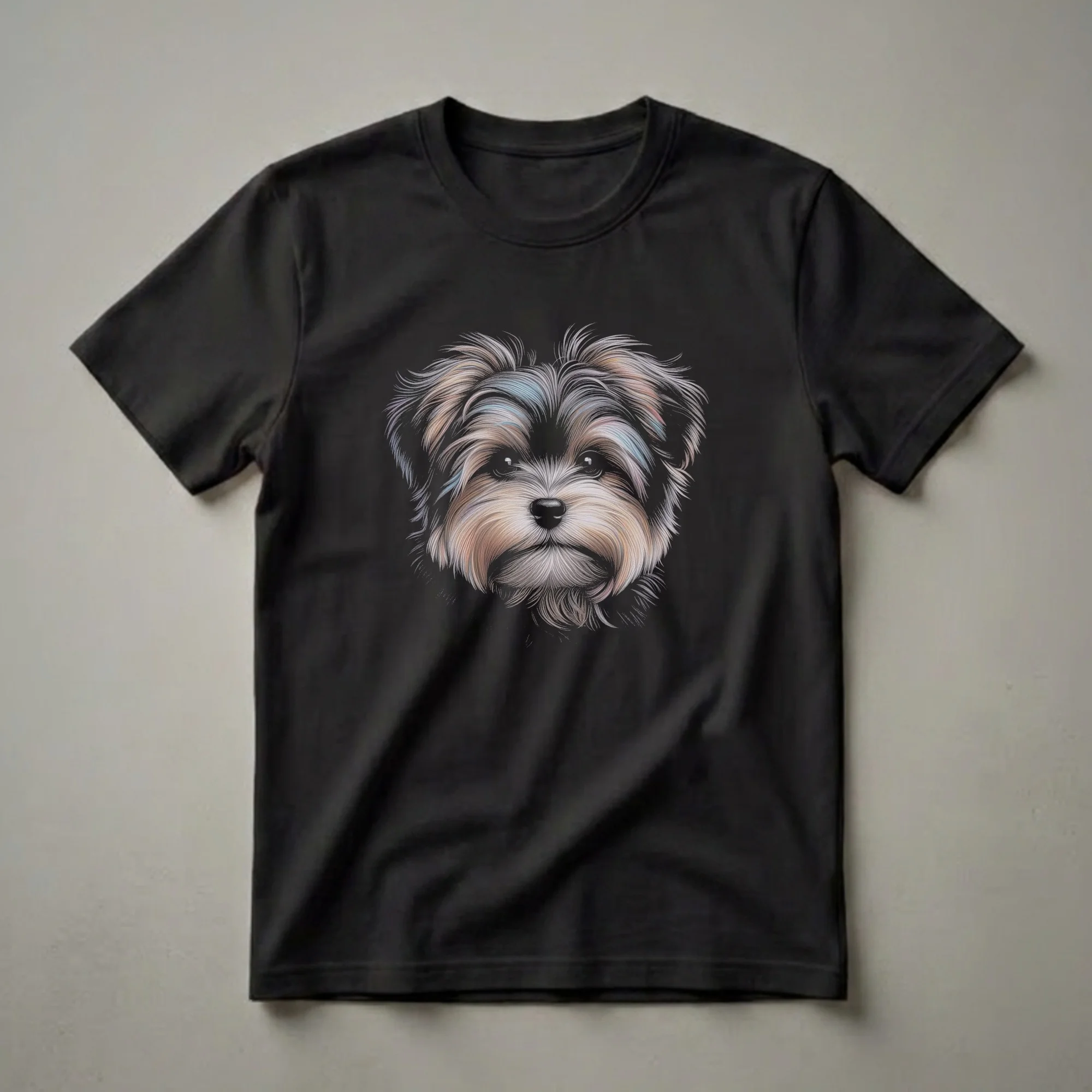 Share your Morkie love with this artistic portrait, showcasing the charming face of your favorite Maltese-Yorkshire Terrier mix with exquisite detail. This eye-catching t-shirt features a beautifully rendered artistic drawing of a Morkie's face, capturing the breed's distinctive features with intricate detail and a blend of warm and cool tones. The artwork stands out against the solid black background, making it a true statement piece for any dog enthusiast. Morkies, a cross between a Maltese and a Yorkshire Terrier, are known for their playful personalities and loyalty, often forming strong bonds with their families. This shirt is a wonderful way for any Morkie mom or dad to express their devotion to their furry friend. It makes a thoughtful gift for birthdays, holidays, or just because for the Morkie lover in your life. Wear this unique graphic tee to dog parks, casual outings, or while relaxing at home with your beloved pet.