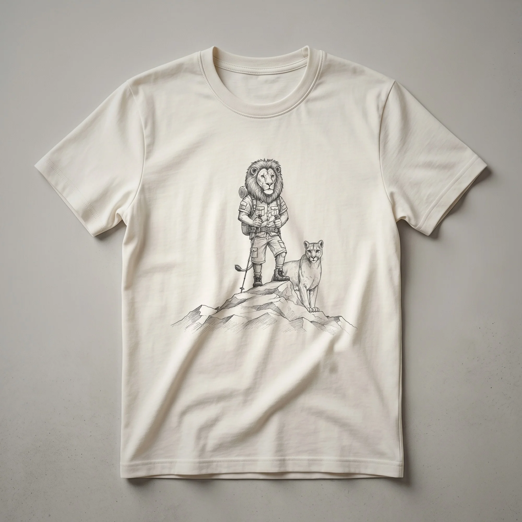 - Graphic t-shirt featuring a stylized mountain lion on a hike.