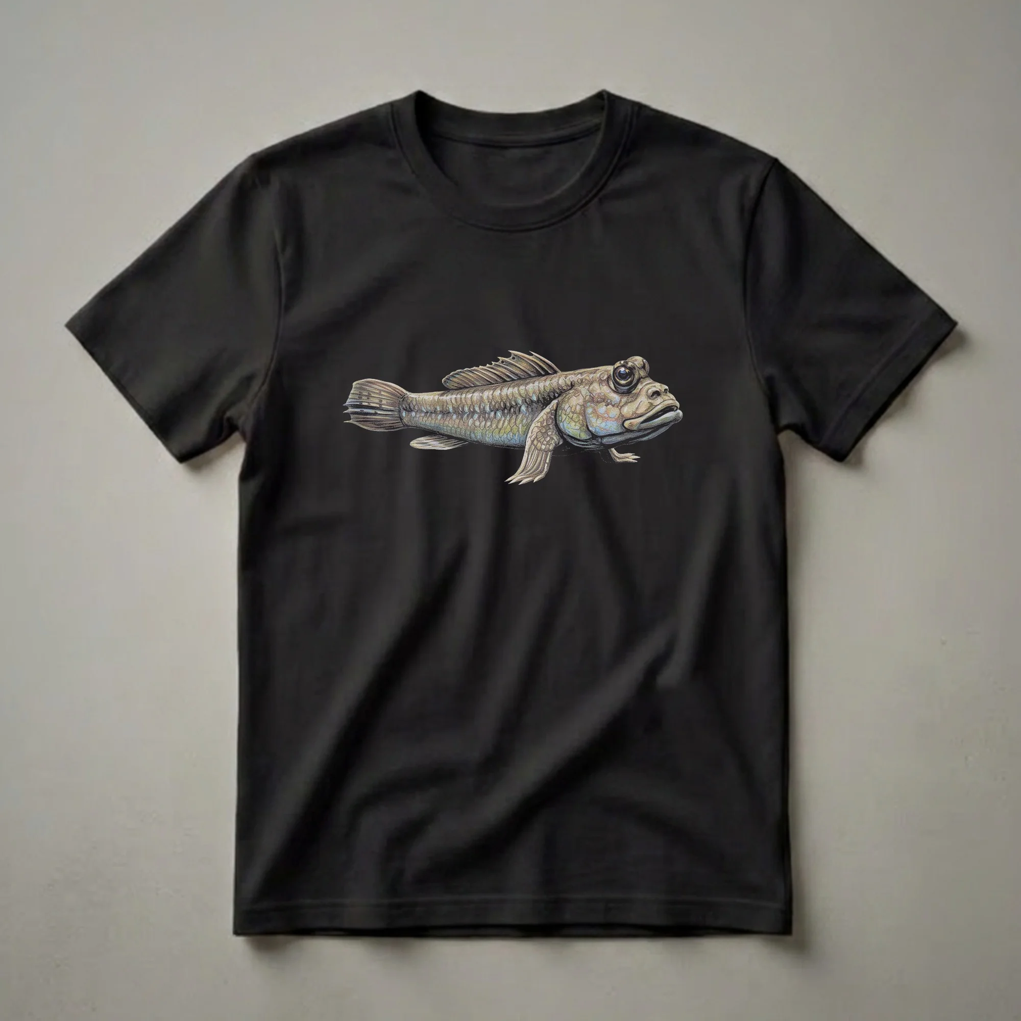 Marine life enthusiasts will appreciate this striking t-shirt featuring a detailed, vintage-style drawing of a mudskipper. This unique fish, known for its ability to 'walk' on land using its pectoral fins and its bulging eyes that can see above water, is depicted with intricate scales and fins. Mudskippers inhabit mangrove swamps, tidal flats, and estuaries, thriving in both aquatic and terrestrial environments. This graphic tee is a fantastic way for ocean lovers to express their fascination with these amphibious creatures. It makes a thoughtful gift for anyone who admires the diverse and fascinating world of marine biology or enjoys unique wildlife art. Wear this shirt to your next nature walk or casual outing to spark conversations about these incredible amphibious fish. This shirt is a staple for any collection celebrating the wonders of the sea.