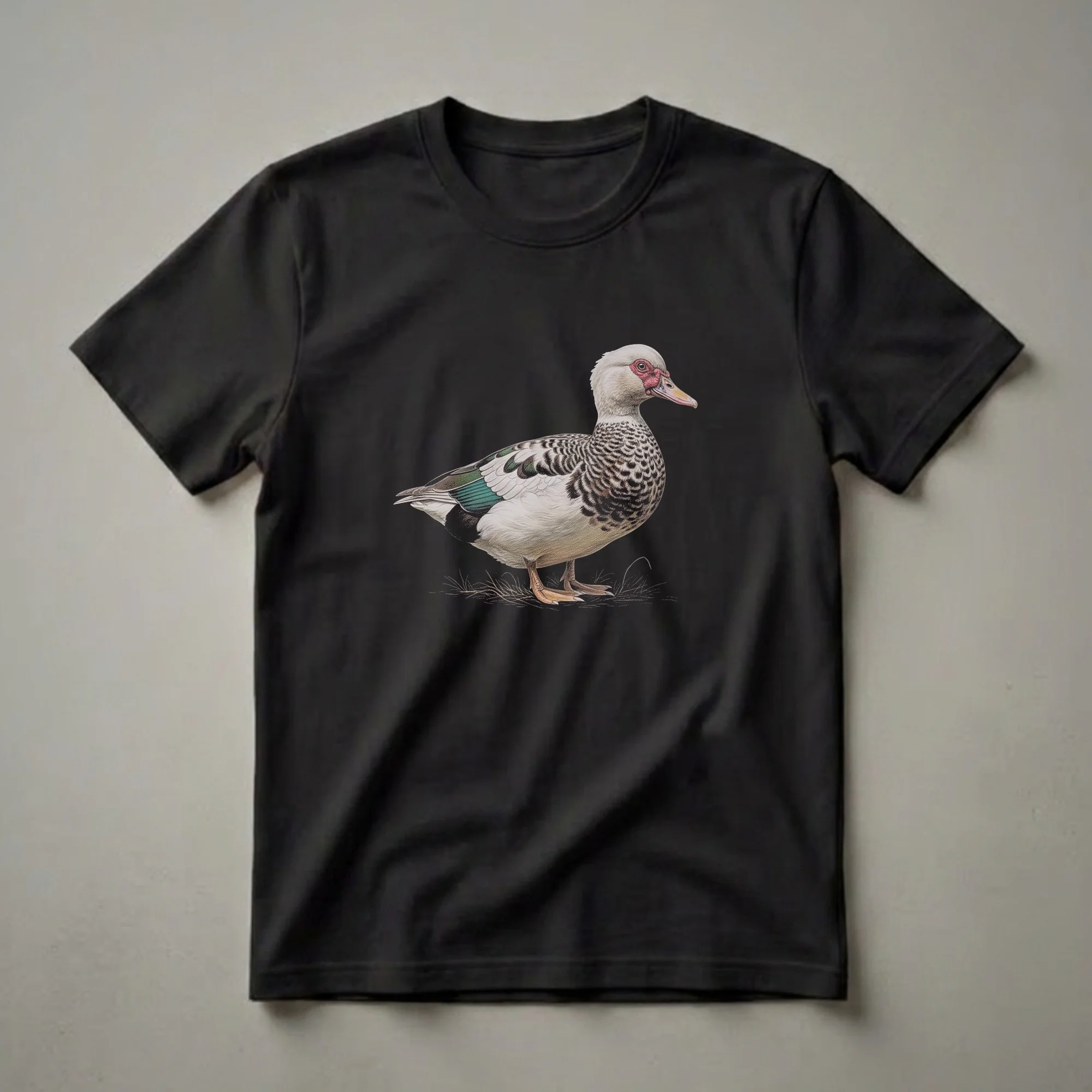 Muscovy duck owners and admirers will appreciate the intricate detail in this vintage-style drawing. The artwork features a Muscovy duck, scientifically known as Cairina moschata, depicted with remarkable accuracy. Notice the distinctive caruncles around its eyes and the striking patterns on its plumage, including iridescent green and white feathers on its wings. This particular species, native to Mexico, Central, and South America, is known for its unique appearance and is often found in wetlands and near bodies of water. This graphic tee brings a touch of natural artistry to your wardrobe, making it a standout piece for anyone who cherishes avian beauty. The detailed rendering captures the essence of this fascinating bird, making this shirt a go-to for birdwatchers, nature photographers, or anyone who enjoys the tranquility of the outdoors. It makes a thoughtful gift for the wildlife enthusiast in your life who appreciates fine art and the natural world. Wear this unique t-shirt on your next nature walk or to a casual gathering where you can share your passion for ornithology.