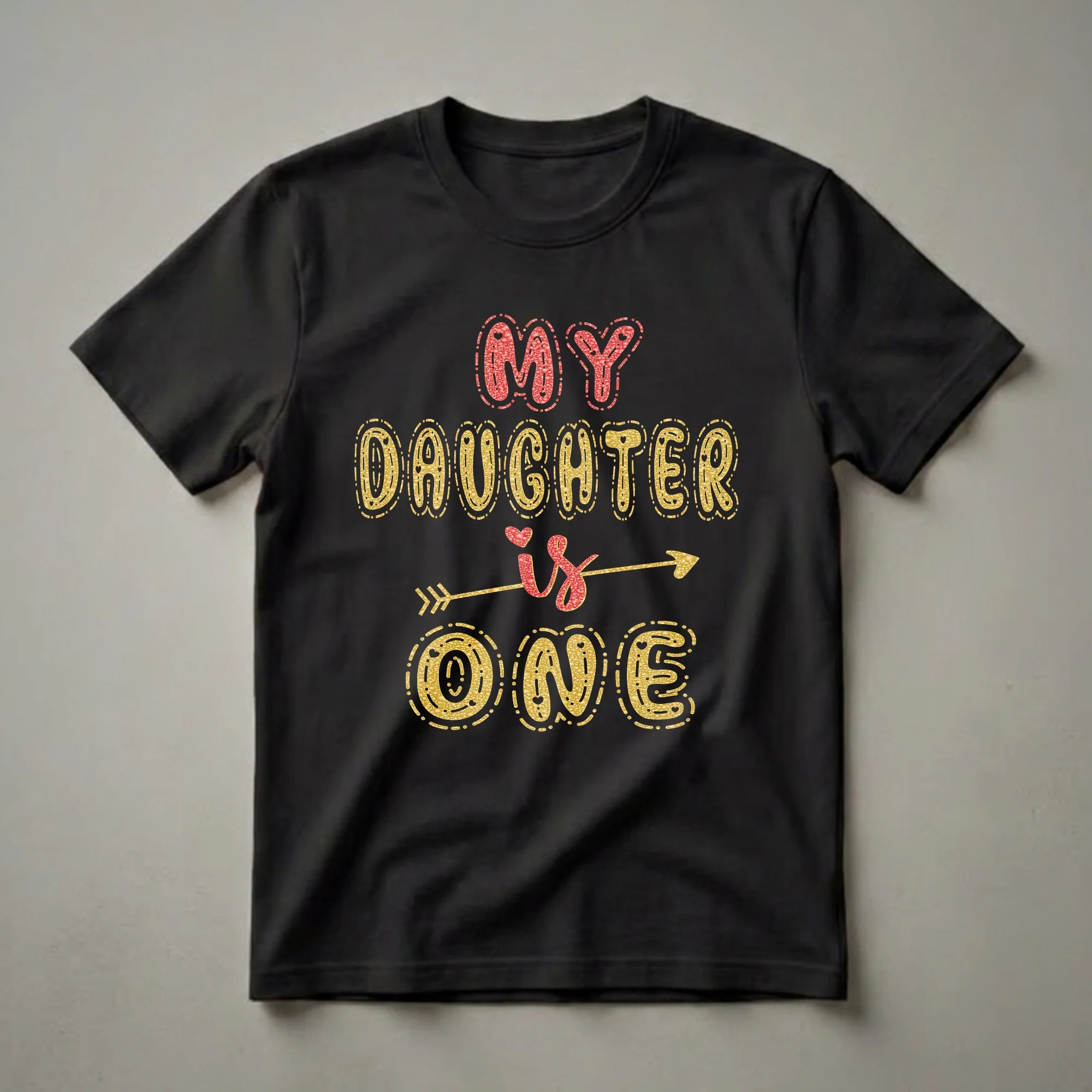 Parents celebrating their daughter's first birthday will reach for this eye-catching graphic tee. The design features bold, bubbly lettering with a glitter effect. "MY DAUGHTER" is displayed in a vibrant red glitter, while "is ONE" is presented in a shimmering gold. An arrow graphic, also in gold, pierces through the word "is," adding a playful touch. The entire design is outlined with a dashed line and small heart accents, enhancing its festive appeal. This t-shirt is a wonderful way for parents to commemorate this significant milestone. The first year of a child's life is filled with rapid growth and discovery, making this "one" birthday a momentous occasion. This shirt makes a thoughtful gift for any parent of a one-year-old girl, a thoughtful choice for birthday photoshoots, parties, or just everyday wear as she embarks on her toddler adventures. It's a charming piece of apparel to mark her very first year. This special tee truly captures the joy of a first birthday.