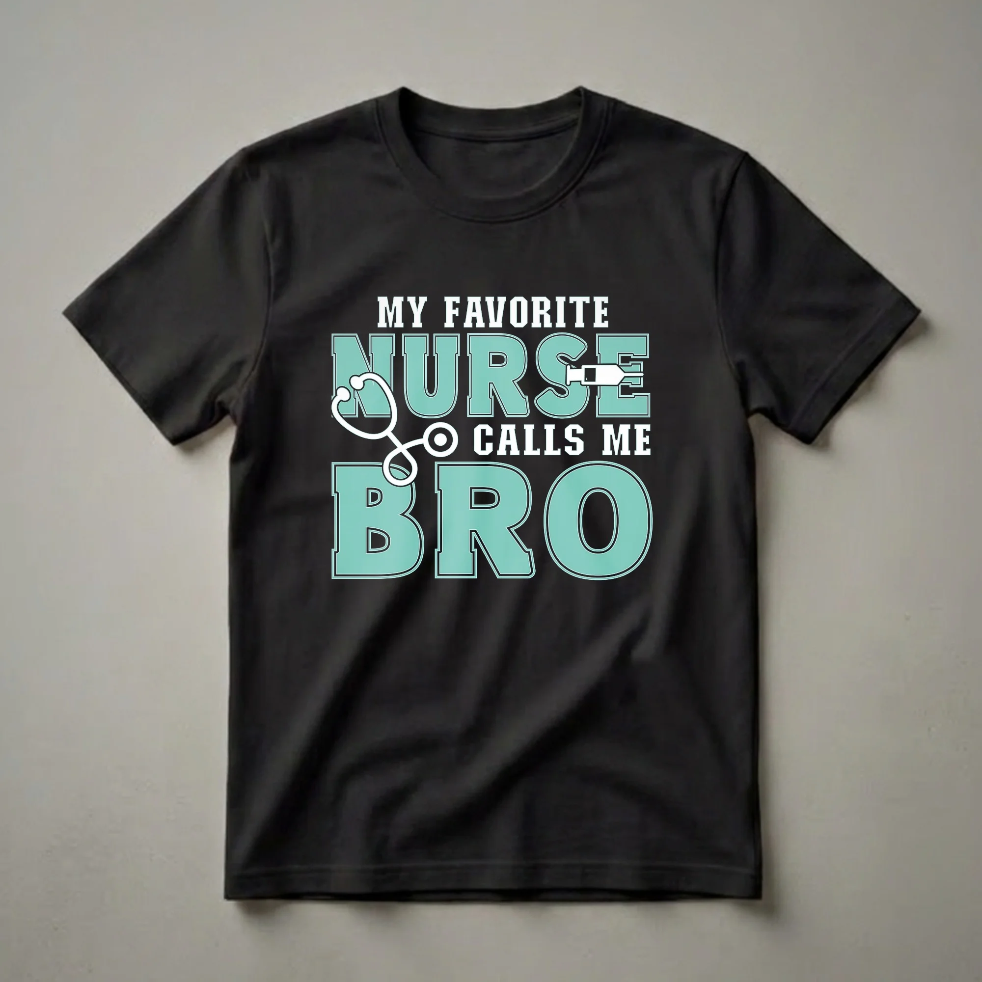 Brothers of nurses can now proudly wear their connection with this humorous graphic tee. The design features bold, teal lettering with a black outline, spelling out "MY FAVORITE NURSE CALLS ME BRO." The word "NURSE" is creatively integrated with a white stethoscope and a syringe, symbolizing the medical profession. This shirt is a thoughtful gift for any brother who has a sister or other family member working as a nurse. It speaks to the unique bond and inside jokes that can exist within families where one member is dedicated to healthcare. Nurses often work long, demanding shifts, and this shirt offers a lighthearted way to acknowledge their important role while celebrating the sibling relationship. It’s a staple in the collection for anyone who wants to show support and share a laugh with their favorite nurse. This tee works well for casual outings, family gatherings, or as a fun conversation starter. Give this shirt as a gift for a birthday or just because, to make your favorite nurse's brother smile.