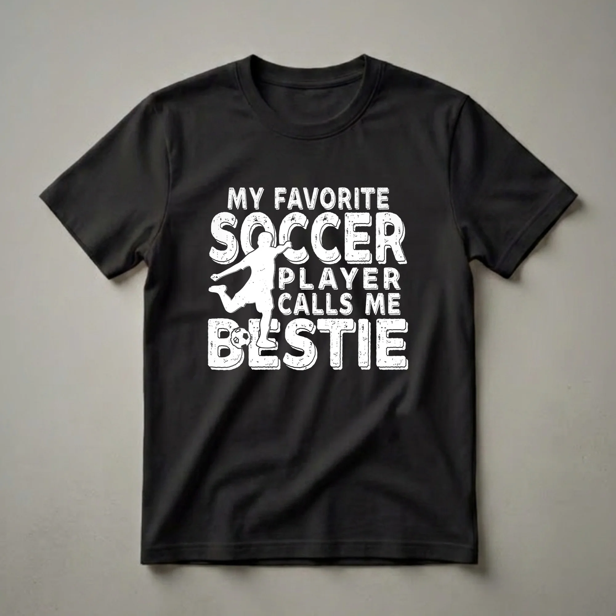 - Features a distressed white graphic with a soccer player and the text 'My Favorite Soccer Player Calls Me Bestie'.