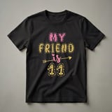 Eleven is a significant age, marking a transition into double digits and the early stages of pre-adolescence. This eye-catching t-shirt celebrates that milestone with a vibrant design. The words "MY FRIEND is 11" are displayed prominently, with "MY" and "is" in a sparkling pink font, while "FRIEND" and the number "11" are rendered in a dazzling gold glitter effect. An arrow with chevron fletching pierces through the word "is", adding a playful touch. The number "11" is further embellished with stars and dotted outlines, enhancing its festive appeal. This graphic tee is a wonderful way for an 11-year-old to express their excitement about their birthday. It's a thoughtful gift idea for a daughter, niece, or best friend who is turning eleven. Imagine her wearing this shirt to her birthday party, school, or just for a fun day out, feeling celebrated and special. This shirt is a fantastic way to commemorate this exciting year and make her feel like the star she is.