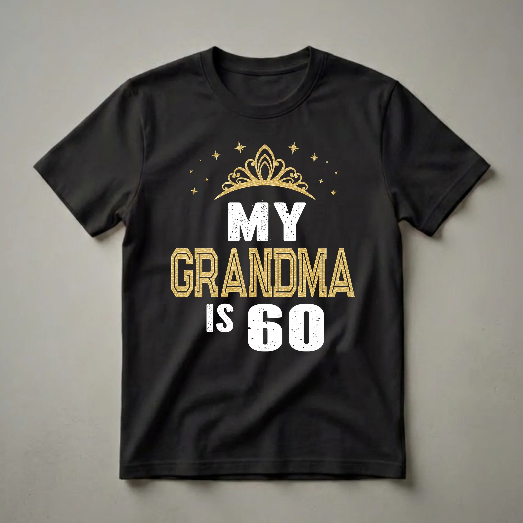 - Showcases 'My Grandma is 60' in distressed white and gold glitter text.