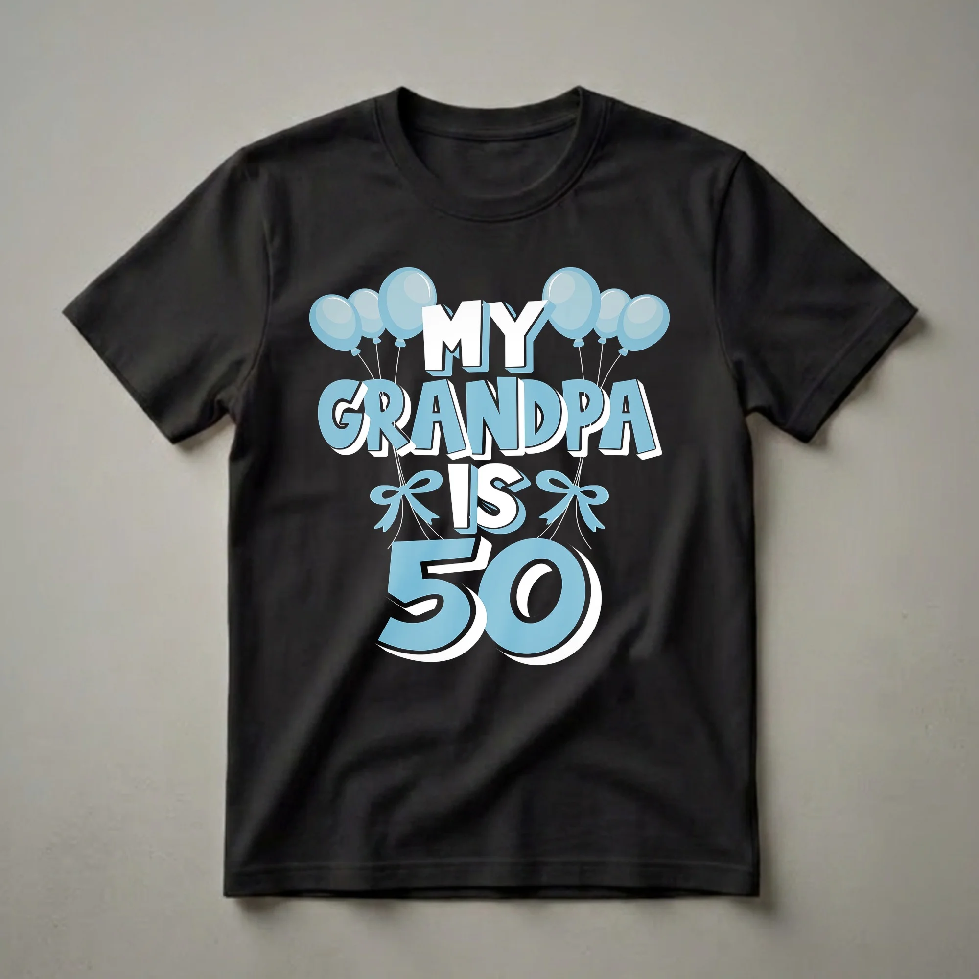 Celebrate your grandad's 50th birthday with this fun graphic tee, announcing to the world that he's officially half a century old! This graphic t-shirt is suited for grandchildren who want to honor their grandpa on this significant birthday. The design features bold, stylized text that reads "MY GRANDPA IS 50," set against a black background. Above the text, a cluster of light blue balloons floats, adding a festive touch. Below the main message, two light blue bows hang, connected by thin white strings, further enhancing the celebratory feel. The number "50" is prominently displayed in large, light blue numbers with a white outline and a subtle shadow effect, making it the focal point of the design. This tee is a thoughtful gift for any grandad reaching this half-century mark, whether it's for a birthday party, a family gathering, or just to show appreciation. It's a fun way for grandkids to express their love and celebrate their grandpa's special day. This shirt works well for a casual birthday brunch or a lively party.