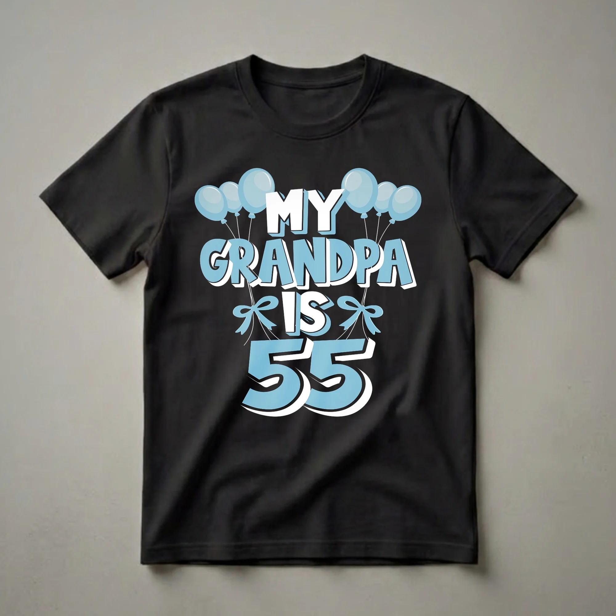 - Features a bold 'MY GRANDPA IS 55' graphic with balloons and bows.