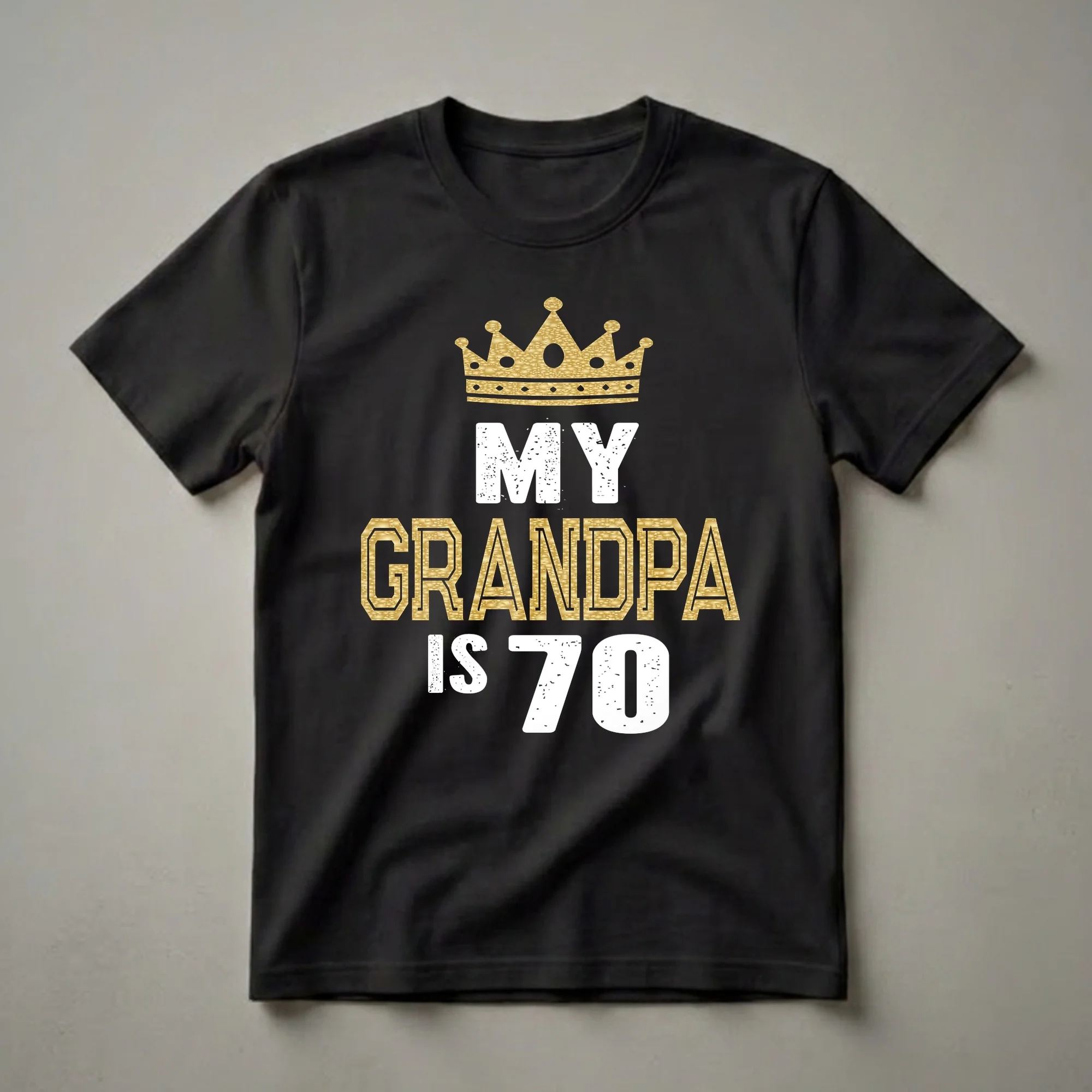 Seventy years is a significant milestone, and this graphic tee is a fantastic way for grandchildren to celebrate their grandpa. The design prominently features a regal golden crown, symbolizing the king of the family, positioned above bold text that reads 'MY GRANDPA IS 70'. The words 'MY GRANDPA' are rendered in a distressed white font, while 'IS 70' is presented in a striking gold with a textured, glitter-like effect, making the number stand out. This shirt is a thoughtful gift for any grandchild looking to honor their grandfather on his 70th birthday. It’s a piece of apparel that he can wear to birthday parties, family gatherings, or casual outings, proudly displaying his age and the love from his family. Turning 70 marks a new chapter, often associated with wisdom and cherished memories, and this t-shirt captures that celebratory spirit. It makes a wonderful present from grandsons and granddaughters alike, serving as a wearable reminder of a special birthday. This tee is a go-to choice for anyone wanting to make their grandpa feel celebrated and loved on his milestone birthday.