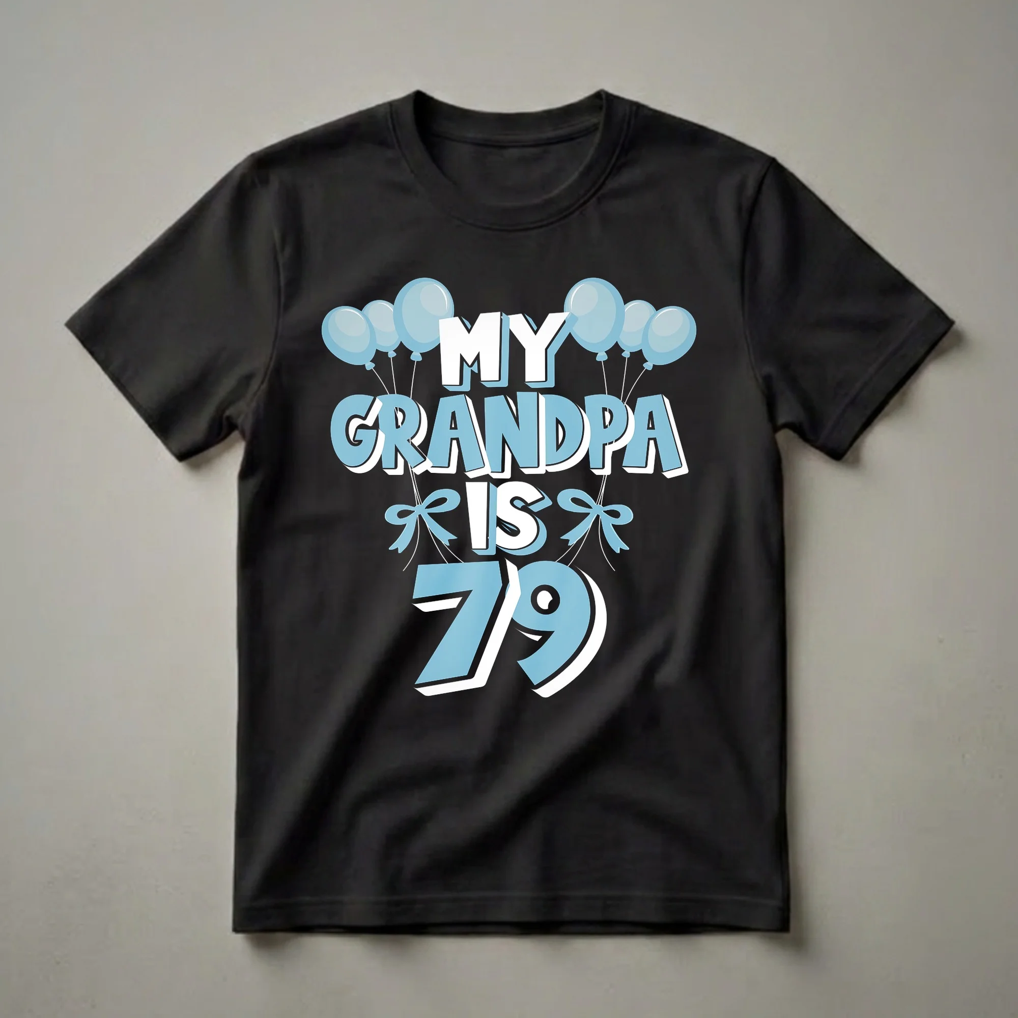 - "My Grandpa Is 79" graphic tee celebrating his 79th birthday milestone.