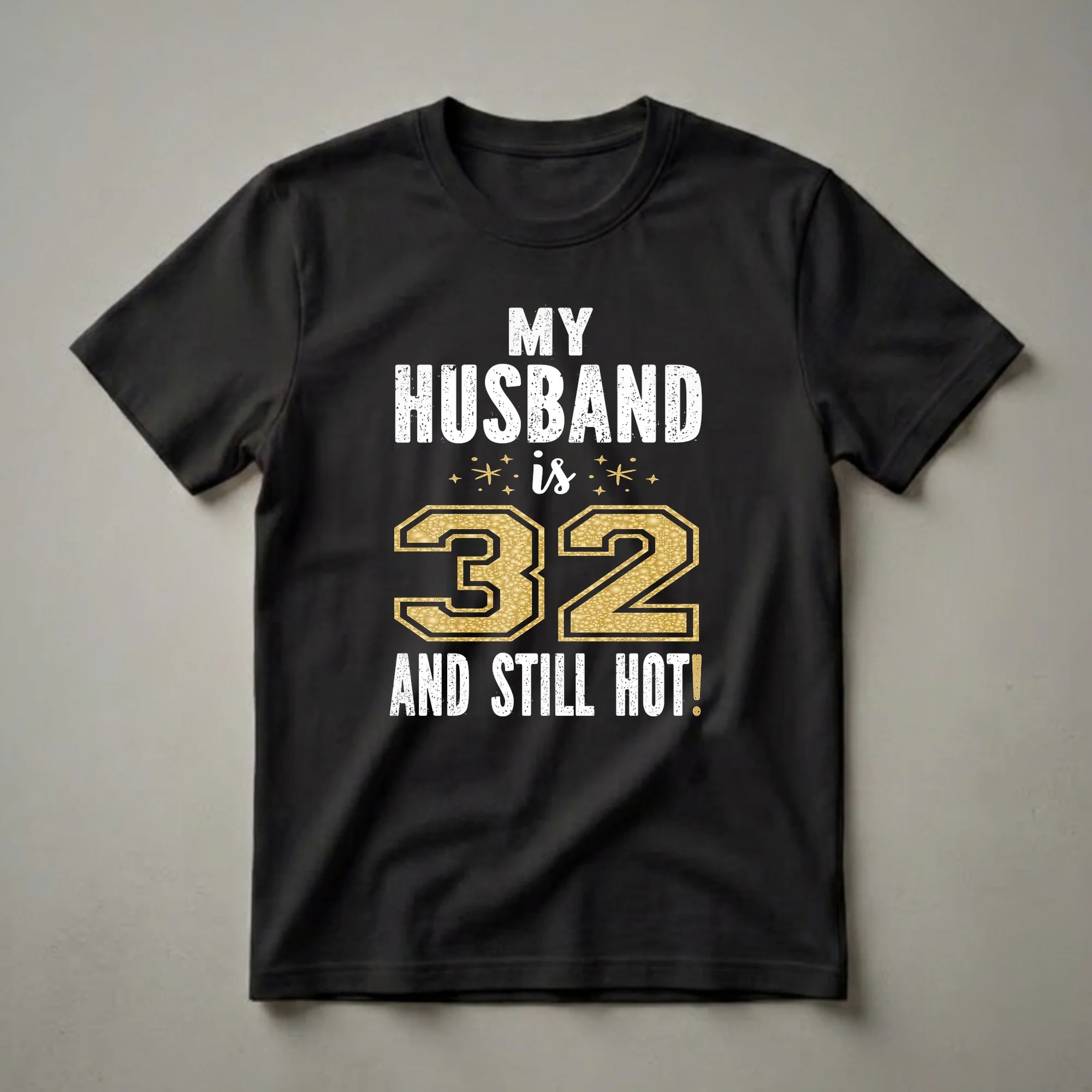 Turning 32 is a significant milestone, and this graphic tee is a bold way for wives to celebrate their husbands. The design features the statement "MY HUSBAND IS 32 AND STILL HOT!" in a mix of distressed white lettering and a striking gold textured number 32. This shirt is a playful declaration of enduring attraction, acknowledging that age is just a number when it comes to style and charisma. It's a thoughtful gift for any wife looking to show appreciation for her husband on his birthday, whether for a birthday dinner, a casual get-together, or just as a fun surprise. This t-shirt serves as a conversation starter and a declaration of love and admiration. It's a staple in the collection for wives who want to make their 32-year-old husband feel celebrated and cherished on his special day. This eye-catching apparel is sure to bring a smile to his face.