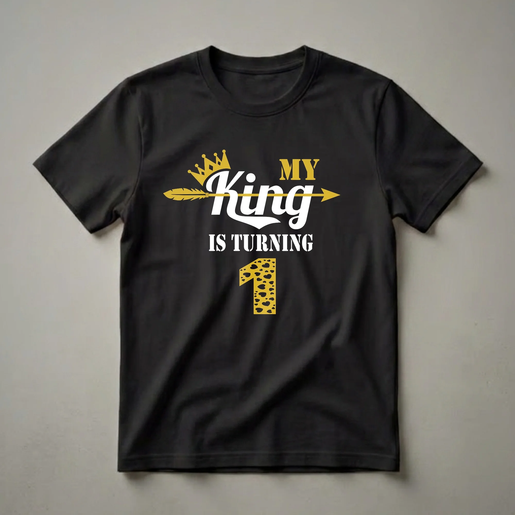 Turning one is a monumental milestone, and this "My King Is Turning 1" t-shirt is the perfect way to celebrate your little prince. The design features a regal gold crown atop the word "King," with a golden arrow piercing through it, symbolizing his journey into his second year. Below, "IS TURNING" is emblazoned in bold white lettering, leading to a striking number "1." This "1" is uniquely adorned with a playful leopard print pattern interspersed with small black hearts, adding a touch of personality and flair. This graphic tee is a fantastic choice for any parent looking for a special outfit for their son's first birthday party, cake smash photos, or family gatherings. It's a thoughtful gift for a 1-year-old boy from grandparents, aunts, uncles, or family friends who want to mark this significant occasion. Imagine him wearing this eye-catching shirt as he explores his first birthday cake or opens presents, creating cherished memories. This shirt is a staple for any little king's first birthday celebration, making him feel like royalty on his big day.