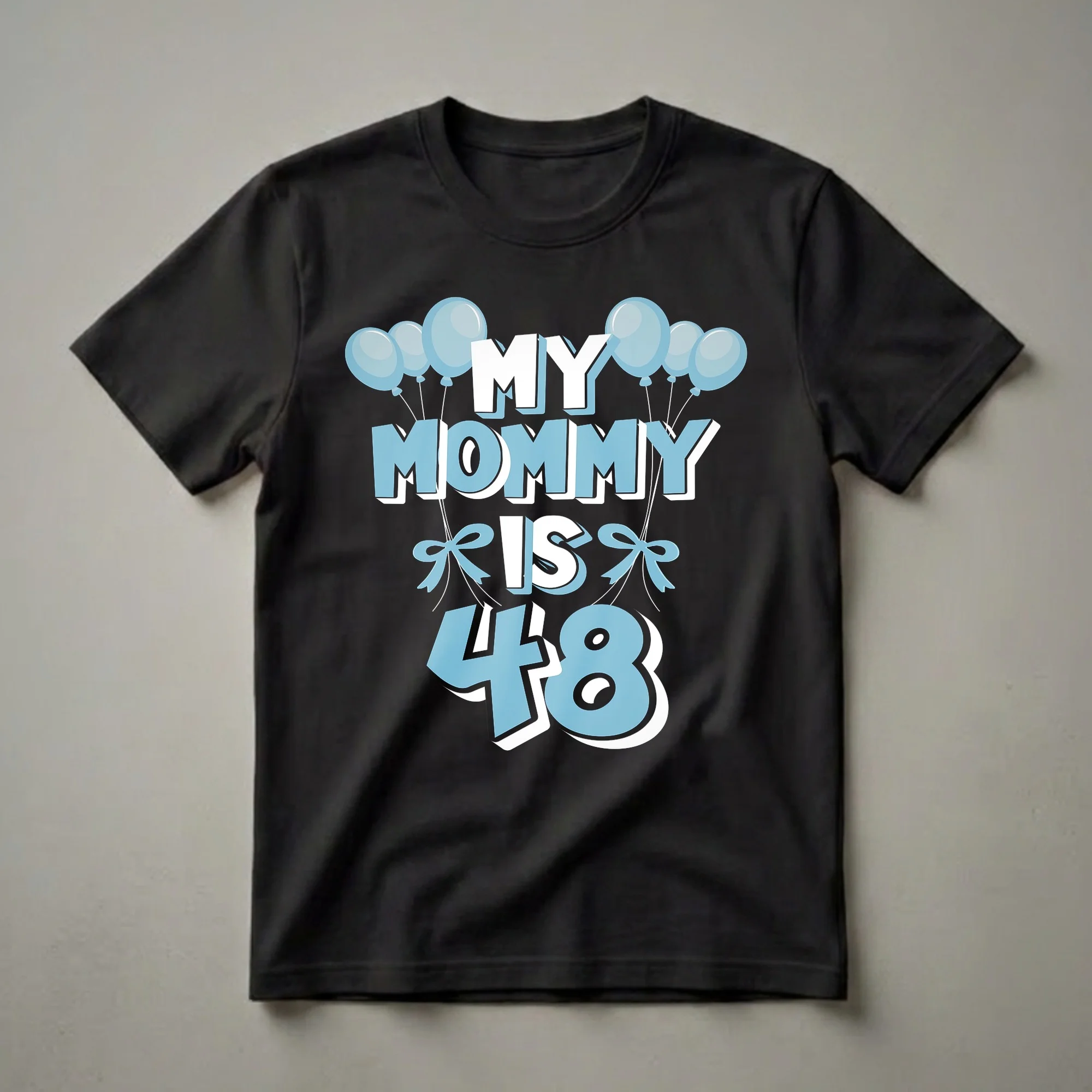 Turning 48 marks a significant milestone, and this vibrant graphic tee is a cheerful way for a child to celebrate their mom. The design features bold, stylized text that reads 'MY MOMMY IS 48' in a playful font, with the number '48' prominently displayed in a light blue hue. Accompanying the text are clusters of light blue balloons tied with ribbons and delicate blue bows, adding a festive and celebratory atmosphere. This t-shirt is a thoughtful gift idea for any child wanting to honor their mother's 48th birthday. It’s a fun way to express love and celebrate this special occasion, making it a go-to tee for birthday brunches or family get-togethers. The clear, eye-catching design ensures the message is delivered with joy and enthusiasm, making Mom feel cherished on her big day. This shirt is a wonderful keepsake for the mom who is turning 48, offering a unique way to commemorate the year.