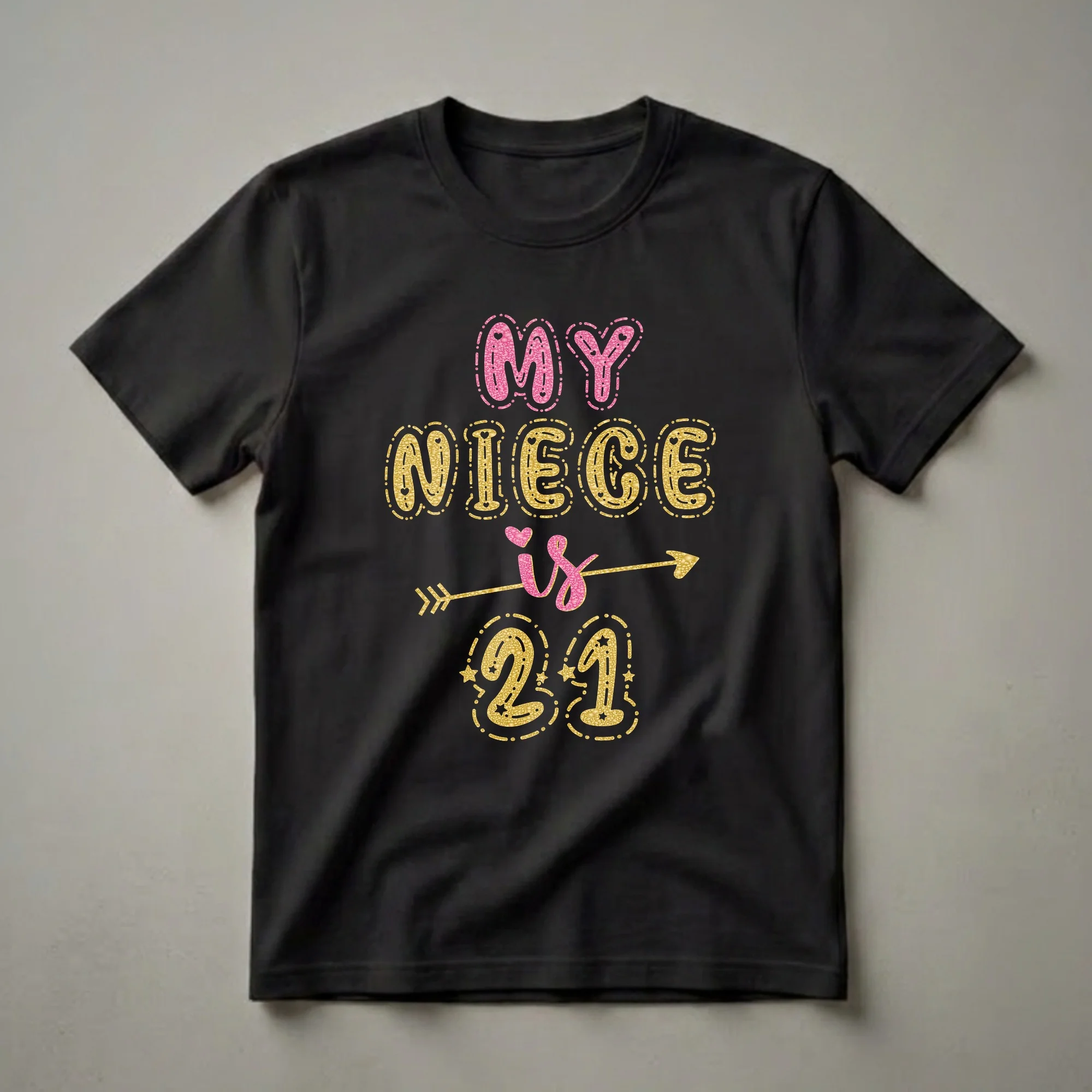Celebrate your favorite niece's momentous 21st birthday with this dazzling pink and gold glitter graphic tee. This festive graphic tee is designed to celebrate that special occasion for your niece. The design features the bold statement 'MY NIECE is 21' rendered in a sparkling glitter effect. The words 'MY' and 'NIECE' are in a playful pink font, while 'is' is a stylized pink cursive, bisected by a golden arrow. The number '21' is prominently displayed in a dazzling gold glitter font, adorned with stars and dotted outlines. This shirt is a thoughtful gift for any aunt or uncle looking to make their niece's 21st birthday celebration memorable. It's a fantastic piece of apparel for her to wear to birthday parties, dinners, or any festive gathering as she embraces this exciting new chapter. The vibrant pink and gold glitter design ensures she'll stand out and feel celebrated on her big day. This t-shirt is a fun way to show your niece you're proud of her as she reaches this important age.