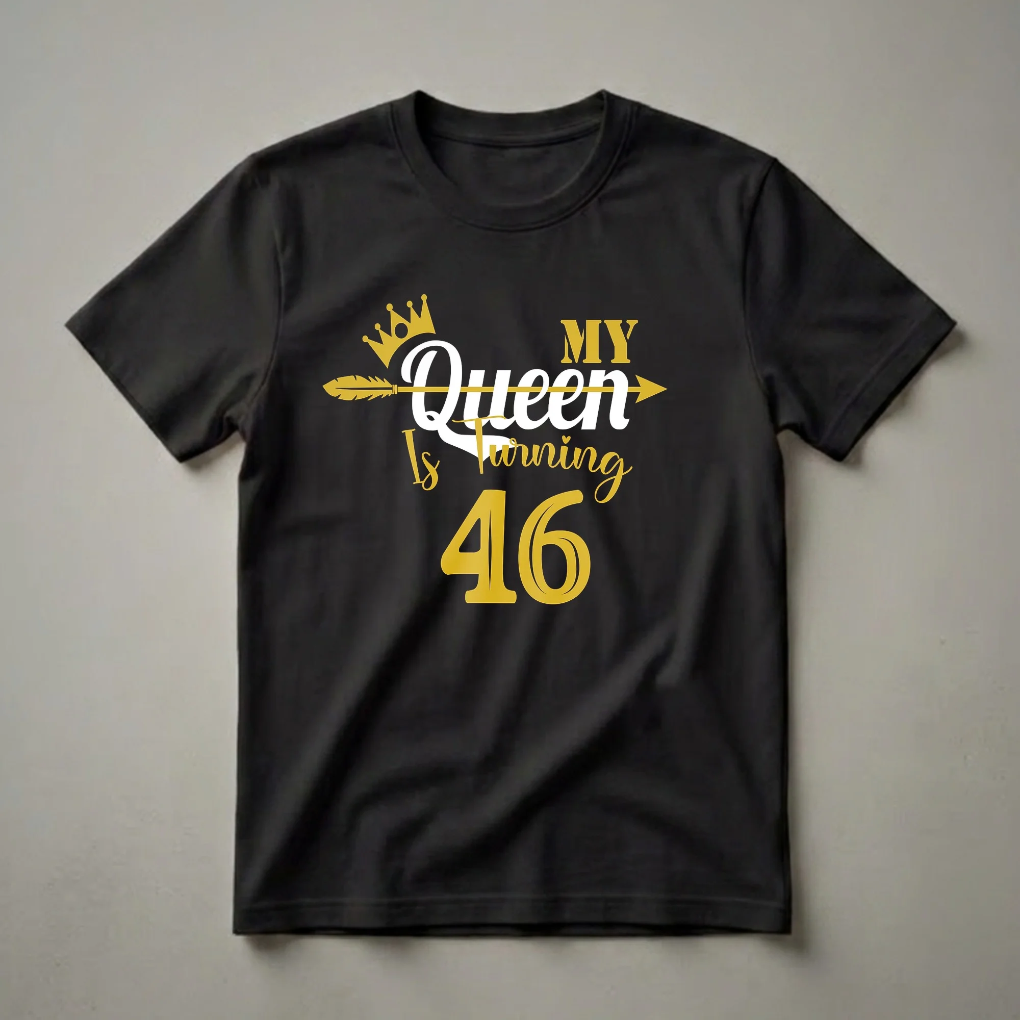 Women celebrating their 46th birthday will love this regal graphic tee. The design features a golden crown and an arrow piercing through the word 'Queen' in white, set against a black background. Bold gold lettering announces 'MY' and 'Is Turning 46', making it clear this shirt is for the birthday queen. Turning 46 marks a significant milestone, often associated with wisdom and established confidence, making this shirt a fitting tribute. This t-shirt is a thoughtful gift for any woman who embraces her age with pride and a sense of royalty. Imagine her wearing this eye-catching shirt to her birthday dinner, a party, or a casual brunch with friends. It’s a fun way for her to showcase her birthday spirit and feel celebrated on her special day. This comfortable tee is a staple in any birthday wardrobe, ready to be worn year after year for celebrations. This shirt truly embodies the spirit of a queen on her special day.