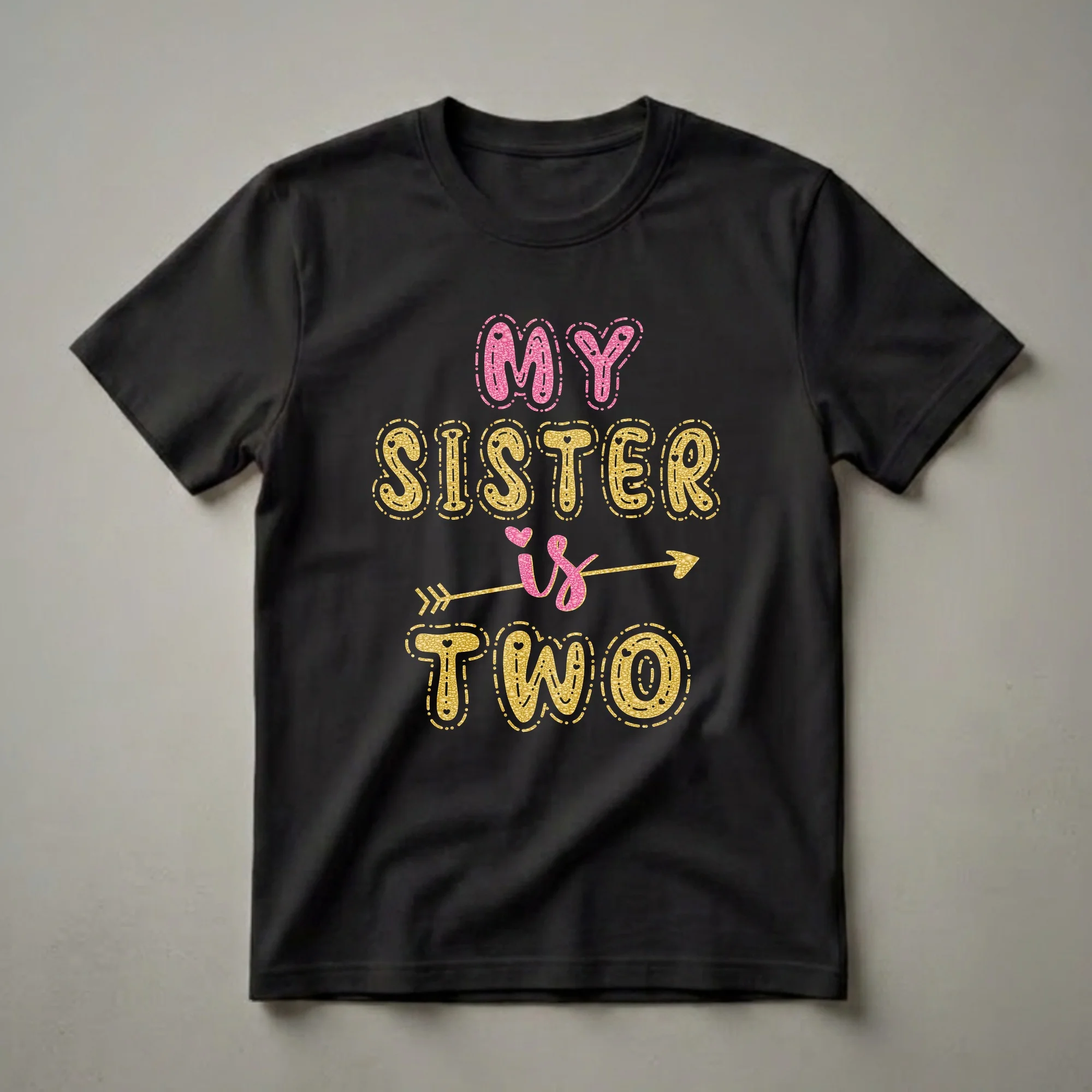 Two years old is a significant milestone, marking a time of rapid growth and discovery for any child. This "My Sister Is Two" birthday shirt captures that joyous occasion with its eye-catching design. The text features bubbly, glitter-filled letters in vibrant pink and gold, outlined with a dashed border and accented with small hearts, creating a festive and celebratory feel. The phrase "My Sister Is Two" is prominently displayed, making it clear this tee is for the birthday girl herself. This t-shirt is a wonderful way for a 2-year-old to express her excitement on her special day. It's also a thoughtful gift idea for parents or relatives looking for a unique present for a niece, granddaughter, or any special little girl turning two. Imagine her delight wearing this shirt to her birthday party, family gathering, or even just for a fun day out. This shirt is a staple for any toddler celebrating this exciting age, offering a playful and memorable way to commemorate her second birthday.