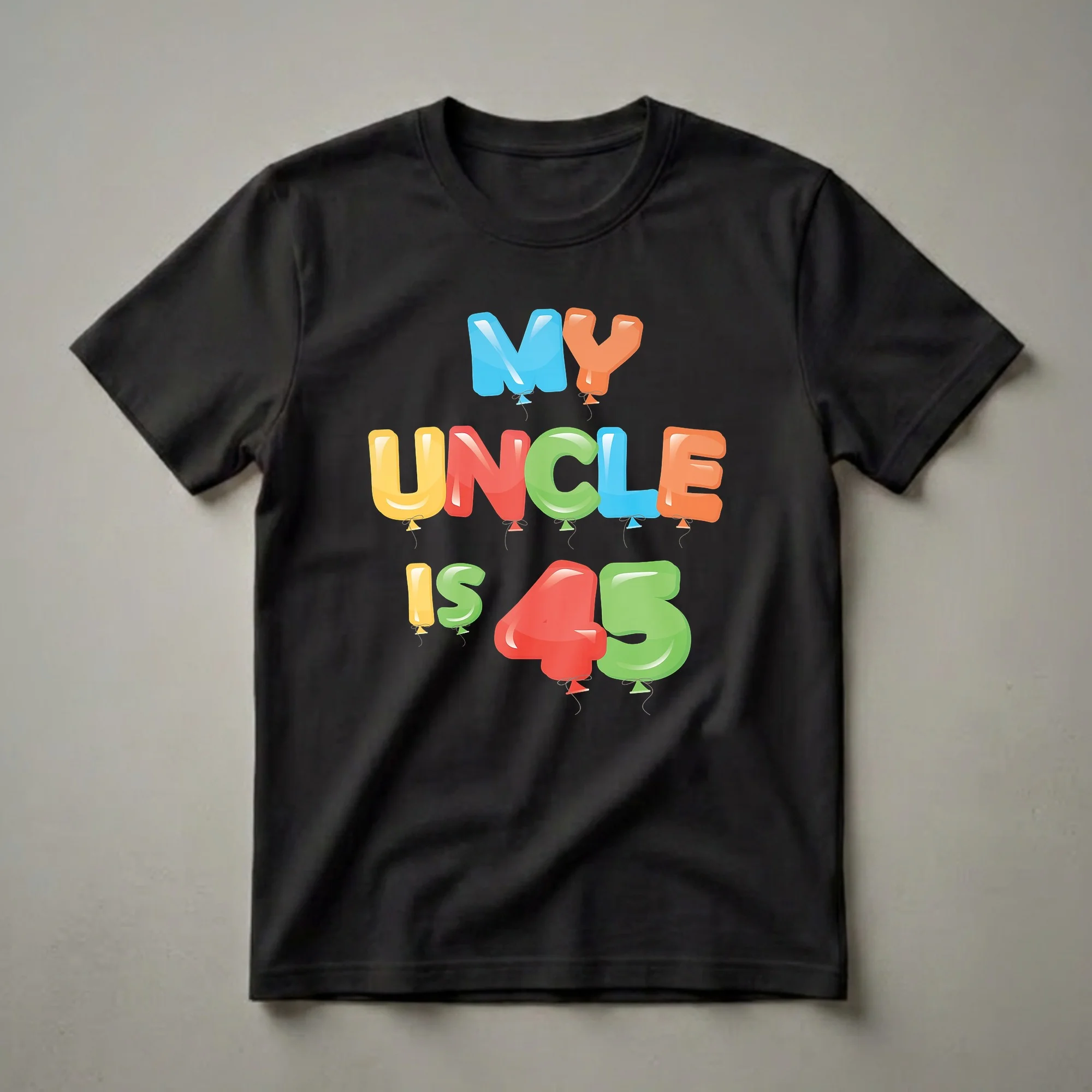 - Uncle's 45th birthday is a milestone! This shirt features fun balloon letters spelling out 'MY UNCLE IS 45'.