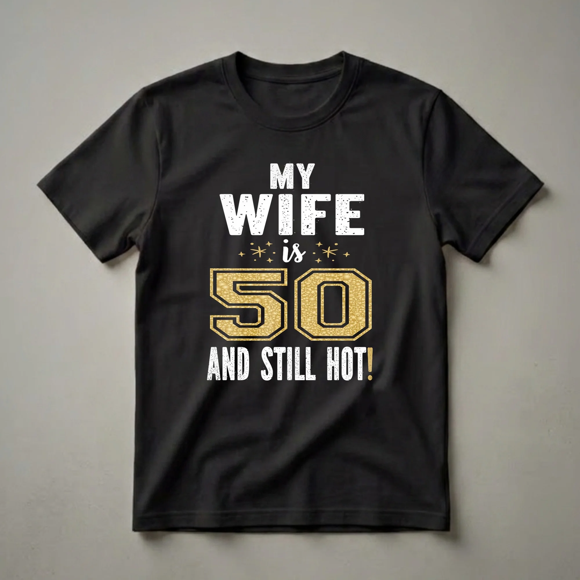Fifty is a significant milestone, marking a half-century of life, experiences, and wisdom. This graphic tee celebrates a woman reaching this age with flair and confidence. The design features bold, distressed white lettering that reads "MY WIFE is 50 AND STILL HOT!". The number 50 is prominently displayed in a large, eye-catching font filled with a shimmering gold texture, reminiscent of glitter or metallic confetti. Small golden stars and dots surround the word "is", adding a festive touch. This t-shirt is a thoughtful gift for a husband to give his wife on her 50th birthday, acknowledging her enduring attractiveness and vitality. It's a playful way to honor her special day, whether she's celebrating with a quiet dinner or a lively party. This shirt is a staple for any woman who embraces her 50s with pride and a sense of humor. She will reach for this tee to wear to birthday celebrations, casual outings, or just to feel fabulous.