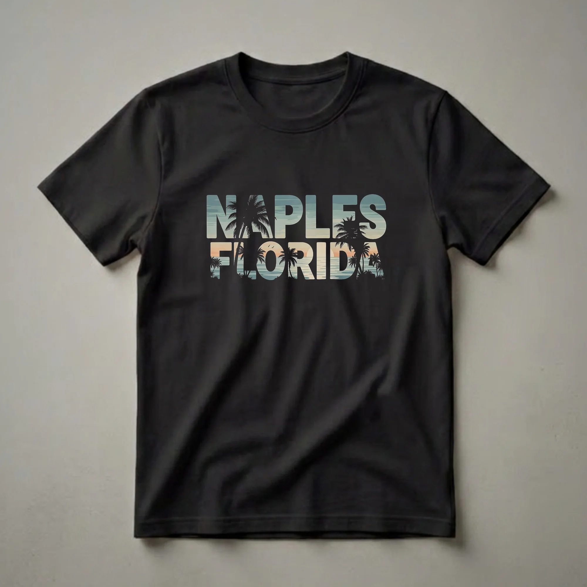 Naples, Florida, a jewel on the Gulf Coast, is celebrated with this striking graphic tee. The design features the city's name, 'NAPLES FLORIDA,' filled with a vibrant retro sunset scene. Silhouetted palm trees stand tall against a sky painted with hues of orange, peach, and muted blue, while gentle waves lap at the shore. This visual evokes the serene beauty and relaxed atmosphere that draws visitors and residents alike to this Southwest Florida paradise. Naples is renowned for its pristine beaches, upscale shopping, and championship golf courses, making it a popular destination for those seeking a luxurious coastal experience. This t-shirt is a thoughtful gift for anyone who has fond memories of visiting or living in Naples, or for those who dream of its sun-drenched shores. It's a staple piece for any Florida travel collection, worn by beachgoers, snowbirds, or anyone who appreciates the unique charm of the Sunshine State. This shirt works well for vacation wear or while reminiscing about sunny days.