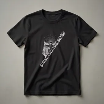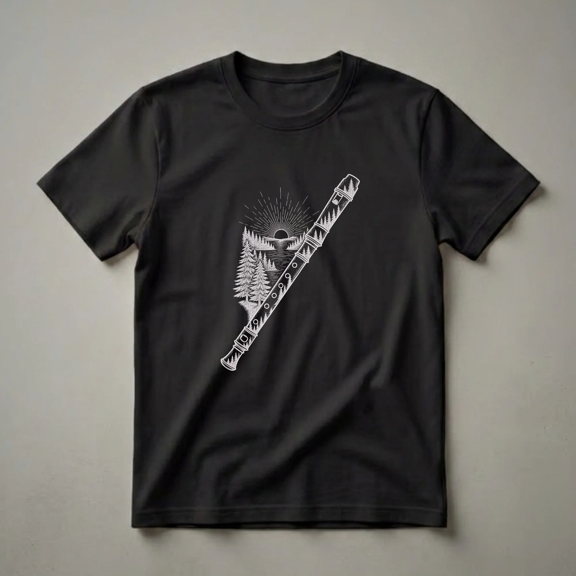 Musicians who appreciate the blend of art and melody will reach for this unique recorder t-shirt. The striking white line art depicts a serene nature scene, complete with a radiant sunburst over a tranquil body of water, framed by detailed pine trees. This artistic representation is cleverly integrated with the form of a recorder, showcasing the instrument's elegant lines and finger holes. Recorders, often among the first instruments people learn, belong to the woodwind family and have a rich history dating back to the Middle Ages. This shirt is a thoughtful gift for any recorder player, music student, or band member who finds inspiration in the great outdoors. It's a perfect tee to wear to band practice, a casual music gathering, or simply while enjoying a peaceful day surrounded by nature. The detailed drawing captures the essence of both musical expression and natural beauty, making it a distinctive addition to any wardrobe. This apparel celebrates the harmonious connection between music and the environment, appealing to those who find solace and creativity in both.