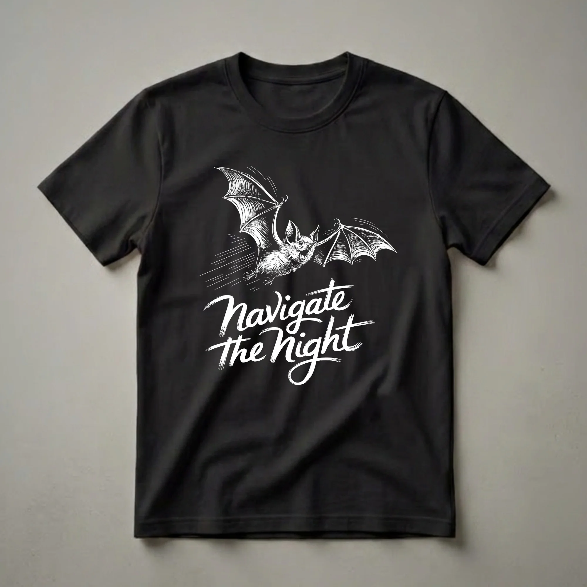 Wildlife enthusiasts and nature lovers will appreciate this striking graphic t-shirt featuring a detailed sketch of a bat in mid-flight. The design captures the creature's agile movement across the night sky, with the bold, brushstroke-style text 'Navigate the Night' completing the visual. Bats are fascinating mammals, with over 1,400 species worldwide, playing crucial roles in ecosystems through pollination and insect control. This tee is a thoughtful gift for anyone who admires these nocturnal flyers or enjoys the mystique of the natural world after dark. Wear this shirt on your next hike, to a nature documentary screening, or simply as a conversation starter about the wonders of wildlife. It's a unique way for bat admirers to express their passion for these often misunderstood animals. This shirt is a go-to tee for those who find beauty in the wild and the mysteries of the night.