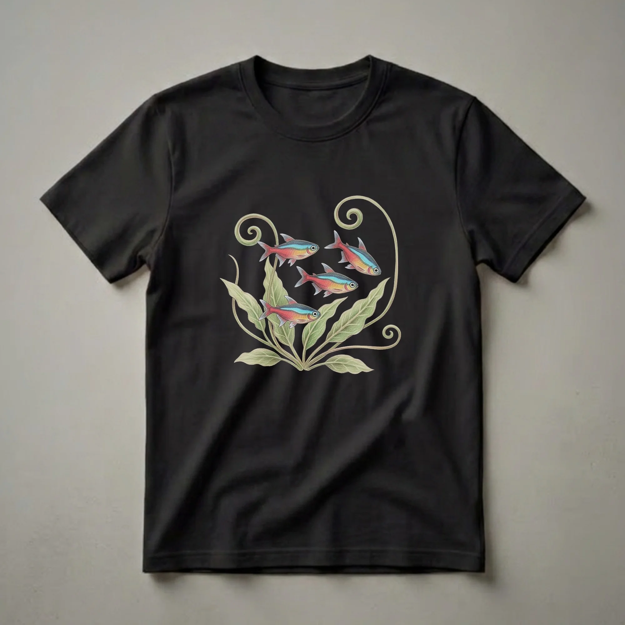 Aquarium hobbyists who appreciate the vibrant beauty of freshwater fish will reach for this striking t-shirt. The design features a detailed, vintage-style colored pencil drawing of four Neon Tetras, scientifically known as Paracheirodon innesi. These small, schooling fish are native to the clear, slow-moving waters of the Amazon basin, particularly in Peru, Colombia, and Brazil. Their distinctive iridescent blue stripe and red flank make them a popular choice for planted aquariums, where they thrive in groups. The artwork captures their lively nature, depicted here swimming gracefully amidst lush green aquatic plants and elegant, swirling tendrils, all set against a deep black background. This tee is a thoughtful gift for anyone who finds joy in maintaining a vibrant freshwater aquarium or simply admires the intricate beauty of these small, colorful swimmers. It's a unique way to express a passion for ichthyology and the serene underwater world. Wear this shirt to your next aquarium club meeting or while tending to your own aquatic paradise.