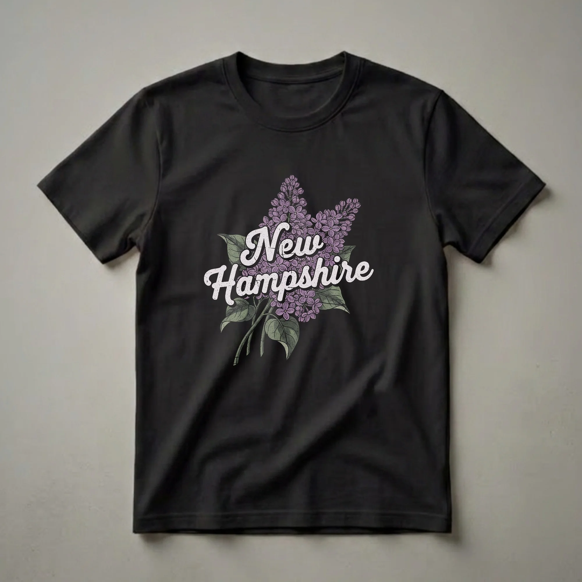 New Hampshire residents and admirers of the Granite State can now wear their pride with this eye-catching graphic tee. The design features the name 'New Hampshire' in a distinctive, distressed retro font, artfully arranged over a vibrant cluster of purple lilac flowers and lush green leaves. Lilacs are known for their fragrant blooms and are often associated with spring and new beginnings, making this shirt a symbol of renewal and state pride. New Hampshire, known for its stunning natural beauty, from the White Mountains to its short but scenic coastline, offers a unique charm that this shirt captures. This t-shirt works well for anyone who cherishes their New Hampshire roots or has fond memories of visiting the state. It makes a thoughtful gift for friends, family, or anyone who appreciates vintage-inspired state apparel. Wear this tee to local events, casual outings, or simply as a daily reminder of the beauty of New Hampshire. This comfortable shirt is a staple for any wardrobe, well suited for showcasing your connection to the state.
