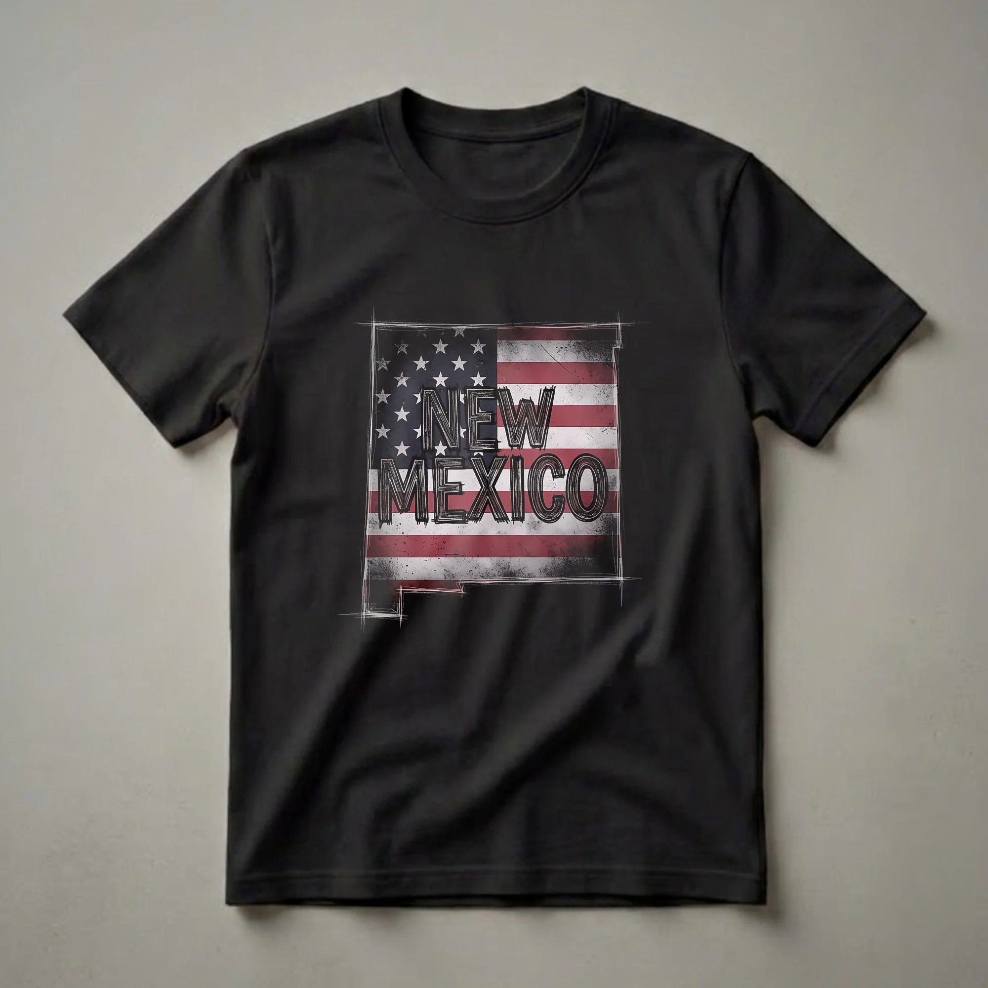 New Mexico residents and fans of the Land of Enchantment can proudly display their state pride with this striking graphic t-shirt. The design features the iconic shape of New Mexico filled with a distressed American flag. Bold, hand-drawn style lettering spells out "NEW MEXICO" across the flag, giving it a unique, artistic flair. This tee is a thoughtful gift for anyone who calls New Mexico home or has a special connection to the state. New Mexico, known for its rich cultural heritage and stunning desert landscapes, is the fifth-largest state by area in the United States. It's a place where Native American, Hispanic, and Anglo cultures have blended for centuries, creating a vibrant and unique identity. This shirt works well for casual wear, showing off your state spirit at local events, or as a conversation starter. Whether you're a native New Mexican or simply love the state's distinctive charm, this graphic tee is a go-to item for expressing your connection. Wear it to local festivals, outdoor adventures, or simply while enjoying a New Mexican sunset.