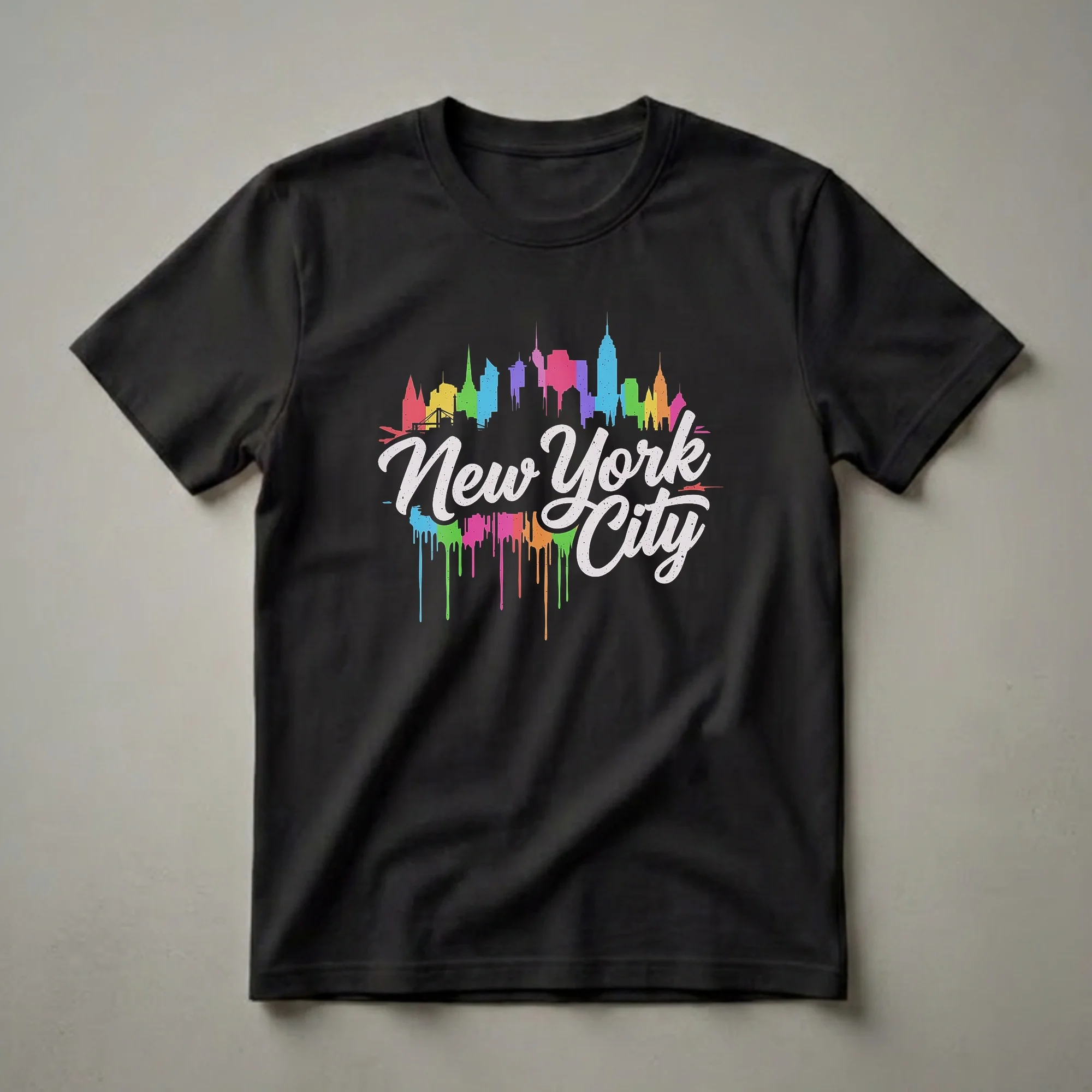 New York City dwellers and admirers of urban art will reach for this striking graphic tee. The design features a vibrant, abstract representation of the iconic New York City skyline, complete with recognizable building silhouettes. Below the cityscape, colorful paint drips in shades of blue, green, pink, orange, and yellow cascade downwards, adding a dynamic and artistic flair. The words "New York City" are emblazoned across the center in a bold, white, distressed script. This t-shirt is a staple for anyone who cherishes the energy and spirit of NYC. It makes a thoughtful gift for New Yorkers, tourists, or anyone who dreams of visiting the city that never sleeps. Wear this shirt to explore the city streets, attend a concert, or simply to express your urban pride. The abstract art style and bold colors make this a unique piece of apparel for your collection. This shirt is a conversation starter, a thoughtful choice for casual outings or as a souvenir from your travels.