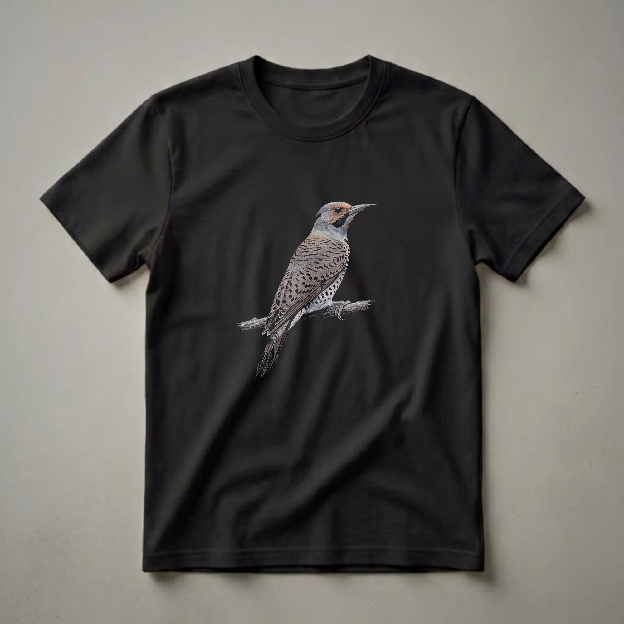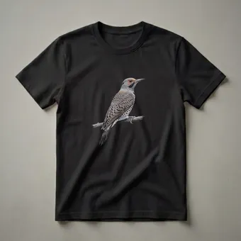 Bird watchers and wildlife enthusiasts will appreciate the intricate detail of this Northern Flicker drawing, presented on a comfortable tee. The artwork captures the distinctive markings of the Northern Flicker, a medium-sized woodpecker known for its vibrant plumage and unique behavior. These birds are commonly found across North America, inhabiting woodlands, fields, and suburban areas, often foraging for insects on the ground. Their presence adds a touch of wild beauty to any landscape. This graphic shirt features a realistic depiction of the bird perched on a branch, rendered with a vintage aesthetic that appeals to those who admire natural art. It’s a staple in the collection for anyone who enjoys observing the diverse avian species around them. This tee makes a thoughtful gift for the ornithologist in your life or for someone who simply enjoys the beauty of nature. Wear it on your next hike, to a birding event, or simply as a conversation starter that highlights your passion for feathered friends. The detailed illustration makes this shirt a standout piece for any nature lover's wardrobe.