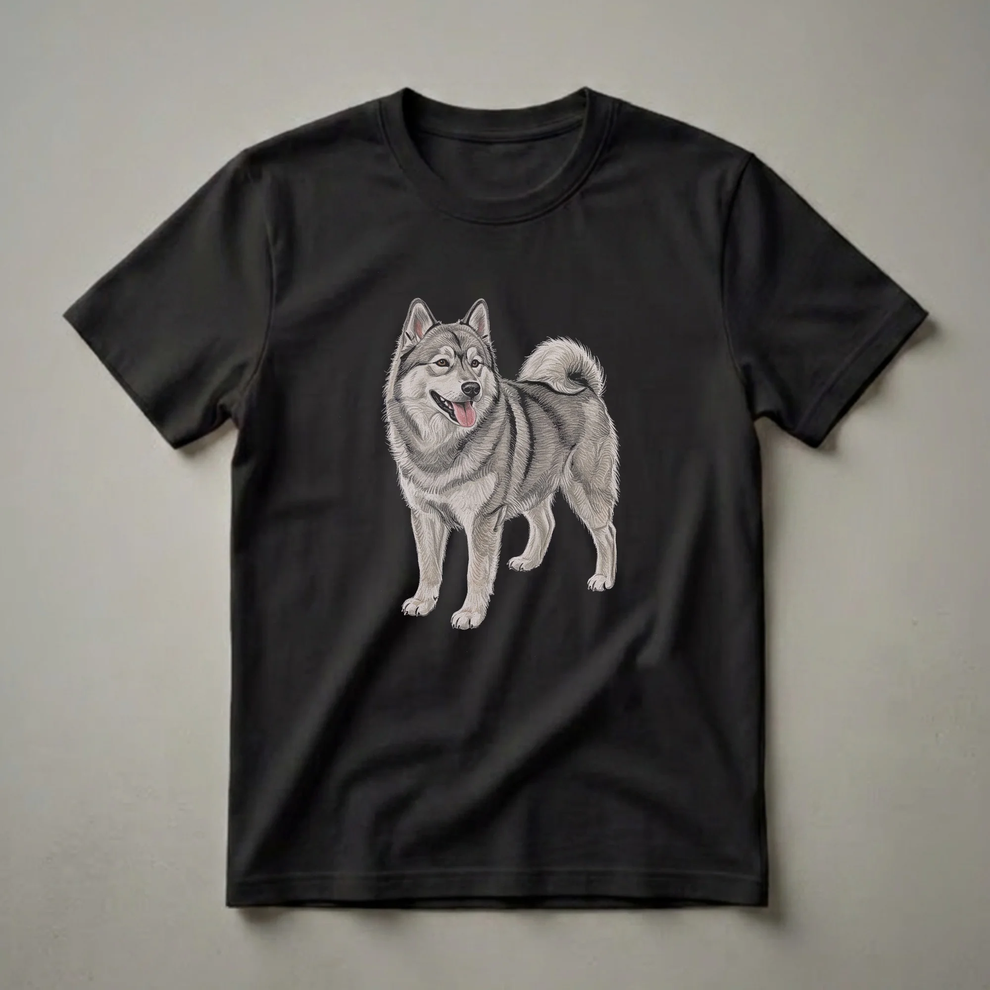 Norwegian Elkhound owners know the breed's history as a versatile hunter and loyal companion. This eye-catching graphic tee features a detailed, vintage-style drawing of a Norwegian Elkhound, capturing its characteristic sturdy build and alert expression. The artwork showcases the dog's thick, grey coat with distinct black markings and its signature curled tail. Norwegian Elkhounds originated in Norway and were historically used for hunting large game like elk and bears, as well as for guarding property. Their intelligence and spirited nature make them beloved pets. This t-shirt is a wonderful way for any Norwegian Elkhound mom or dad to display their affection for their canine friend. It makes a thoughtful gift for dog lovers, especially those who own or admire this specific breed. Wear this shirt to your next dog park visit or casual outing to spark conversations with fellow enthusiasts.