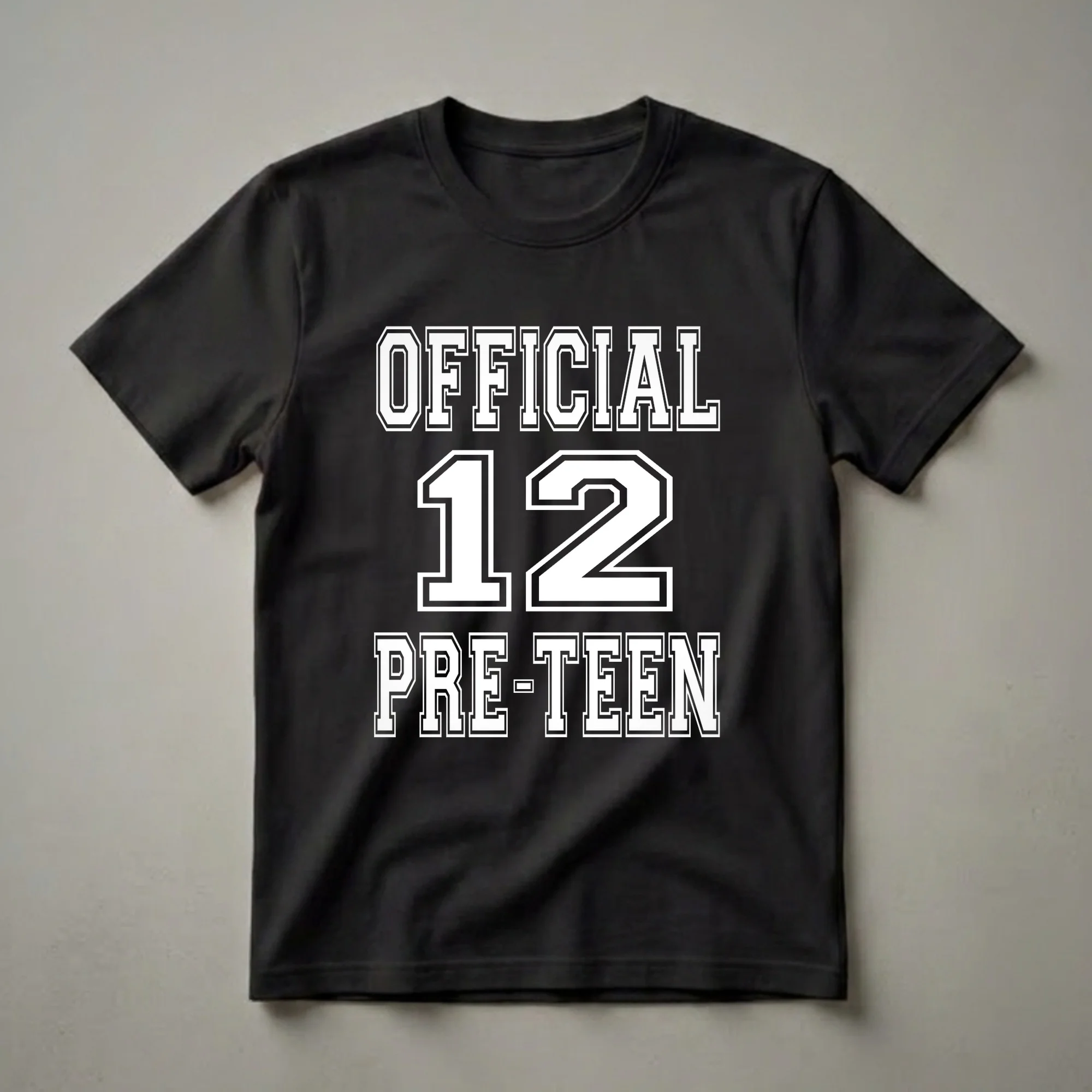 Entering the pre-teen years is a significant milestone, marking a transition from childhood to adolescence. This 'Official 12 Preteen' graphic t-shirt captures that exciting moment. The design features bold, collegiate-style lettering that reads 'OFFICIAL 12 PRE-TEEN' in a striking white font against a black background. This tee is a fantastic way for any 12-year-old to announce their new age and embrace this new chapter. It's a staple for any birthday celebration, whether it's a party, a family dinner, or a casual get-together. This shirt is a thoughtful gift idea for any boy or girl turning twelve, offering a fun and memorable way to commemorate their special day. It's a go-to tee that they'll reach for to show off their preteen status. The clear, impactful design makes it instantly recognizable and a great conversation starter among friends. This apparel is more than just clothing; it's a declaration of entering a new phase of life, celebrated with style and pride.