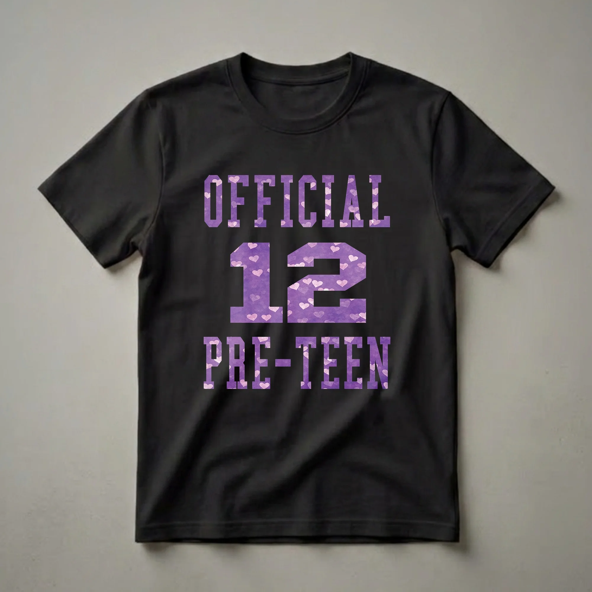 Turning twelve marks a significant transition, moving from childhood into the pre-teen years. This "Official 12 Preteen" graphic tee captures that exciting moment. The design features bold, collegiate-style lettering in a vibrant purple hue, filled with a charming pattern of scattered pink and white hearts. The number '12' is prominently displayed, emphasizing the birthday milestone. This t-shirt is a fantastic way for any girl to celebrate her 12th birthday, whether she's having a party or just wants to show off her new age. It's a staple piece for any young girl's wardrobe as she enters this new phase of life. This shirt makes a thoughtful gift for any girl turning twelve, a thoughtful choice for her birthday celebration or as a special surprise. She will reach for this tee to wear to birthday parties, school events, or casual outings with friends, proudly announcing her 'official' preteen status. The playful heart design adds a touch of sweetness to the bold typography, making it a stylish choice for any tween.