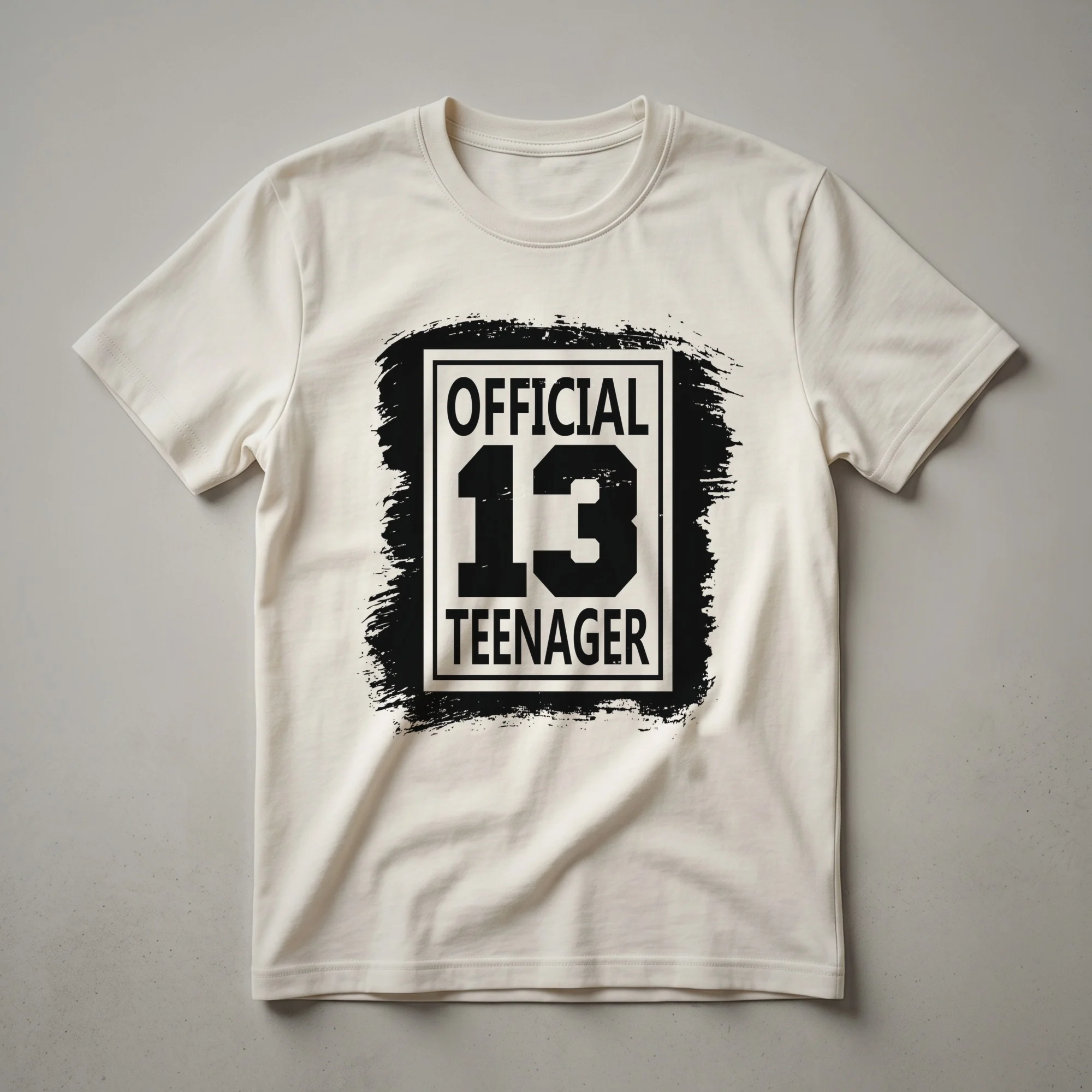 Celebrate your thirteenth birthday in style with this bold statement tee proudly declaring your official teenager status.This graphic tee proudly announces that transition with bold, distressed lettering. The prominent '13' is framed by the words 'OFFICIAL TEENAGER' above and 'OFFICIAL 13' below, all set against a textured, brush-stroke background that adds a touch of edgy style. This shirt is a fantastic way for any boy to showcase his new status as a teenager. It's a staple in any young teen's wardrobe, a go-to for casual wear or for making a statement at birthday celebrations. This tee makes a thoughtful gift for any boy celebrating his thirteenth birthday, whether it's for a party, a family gathering, or just to mark the special occasion. He will reach for this shirt to express his excitement about entering this new chapter of his life. It's a fun and stylish way to commemorate becoming a teenager, a true rite of passage.