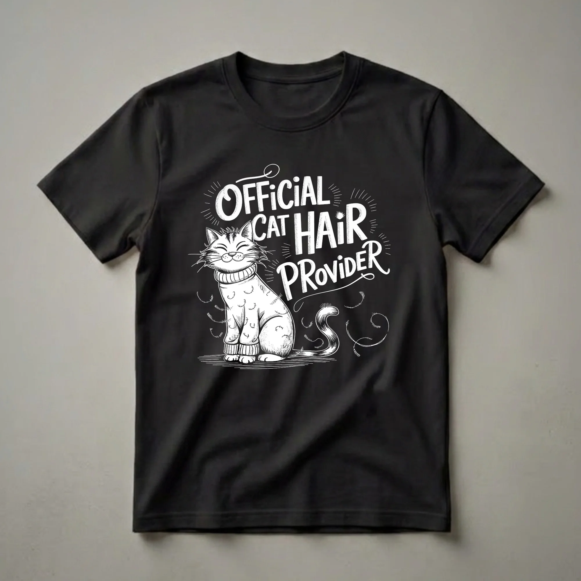 - Features a humorous 'Official Cat Hair Provider' graphic with a cute tabby cat wearing a sweater.
